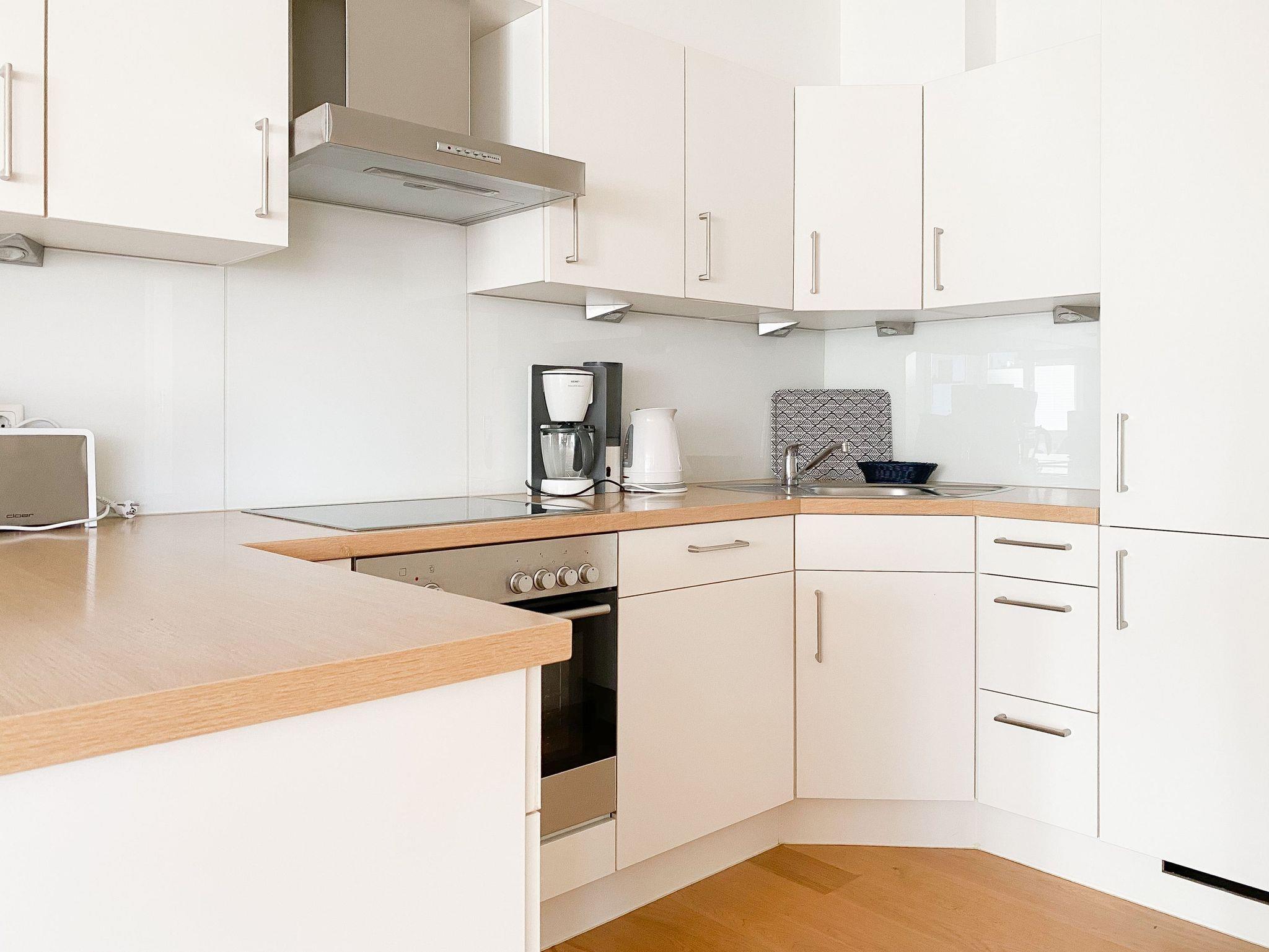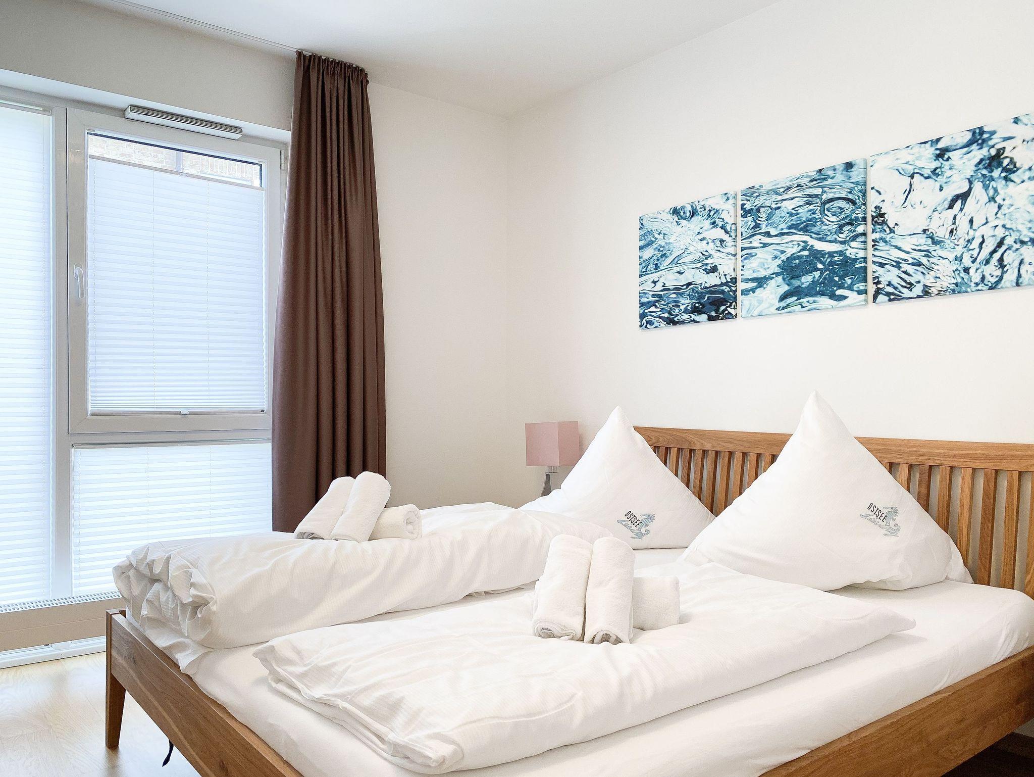 Die 92 qm große Wohnung befindet sich im ersten Obergeschoss und verfügt über zwei separate Schlafzimmer - ausgestattet mit Doppelbett (180x200) und zwei Einzelbetten (80x200) mit TV - [nbsp]ein komfortables Duschbad mit Fußbodenheizung sowie ein separates Gäste WC.[nbsp] Es gibt einen geschmackvollen Wohnbereich mit TV, Radio und WLAN, einen großzügigen Essbereich und eine offene Einbauküche, bestens ausgestattet mit Mikrowelle, Backofen und Spülmaschine.[nbsp] Der großzügige, überdachte Südbalkon bietet in östlicher Richtung einen schönen Blick auf den gegenüberliegenden Park und die Ostsee. Die großen Fensterelemente und das verwendete Echtholzparkett in diesem Objekt sorgen für eine helle, freundliche Wohnatmosphäre. Ankommen und Wohlfühlen!