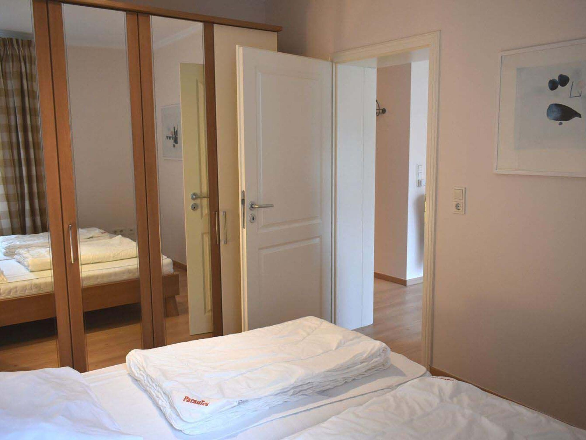 Schlafzimmer 1: 2 Matratzen, 2 Nachttische, 2 Nachttischlampen, Doppelbett 2,00 x 1,80 m, Kleiderschrank, Meerblick, Radiowecker, Spiegel, Verdunklungsstores, Wäscheständer