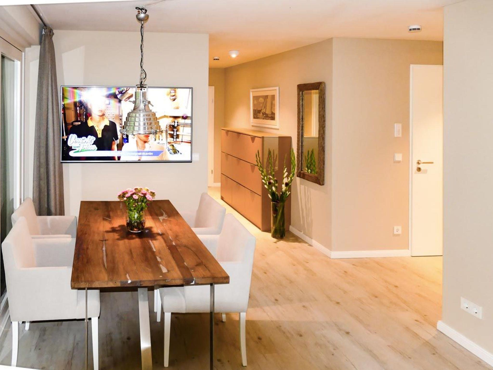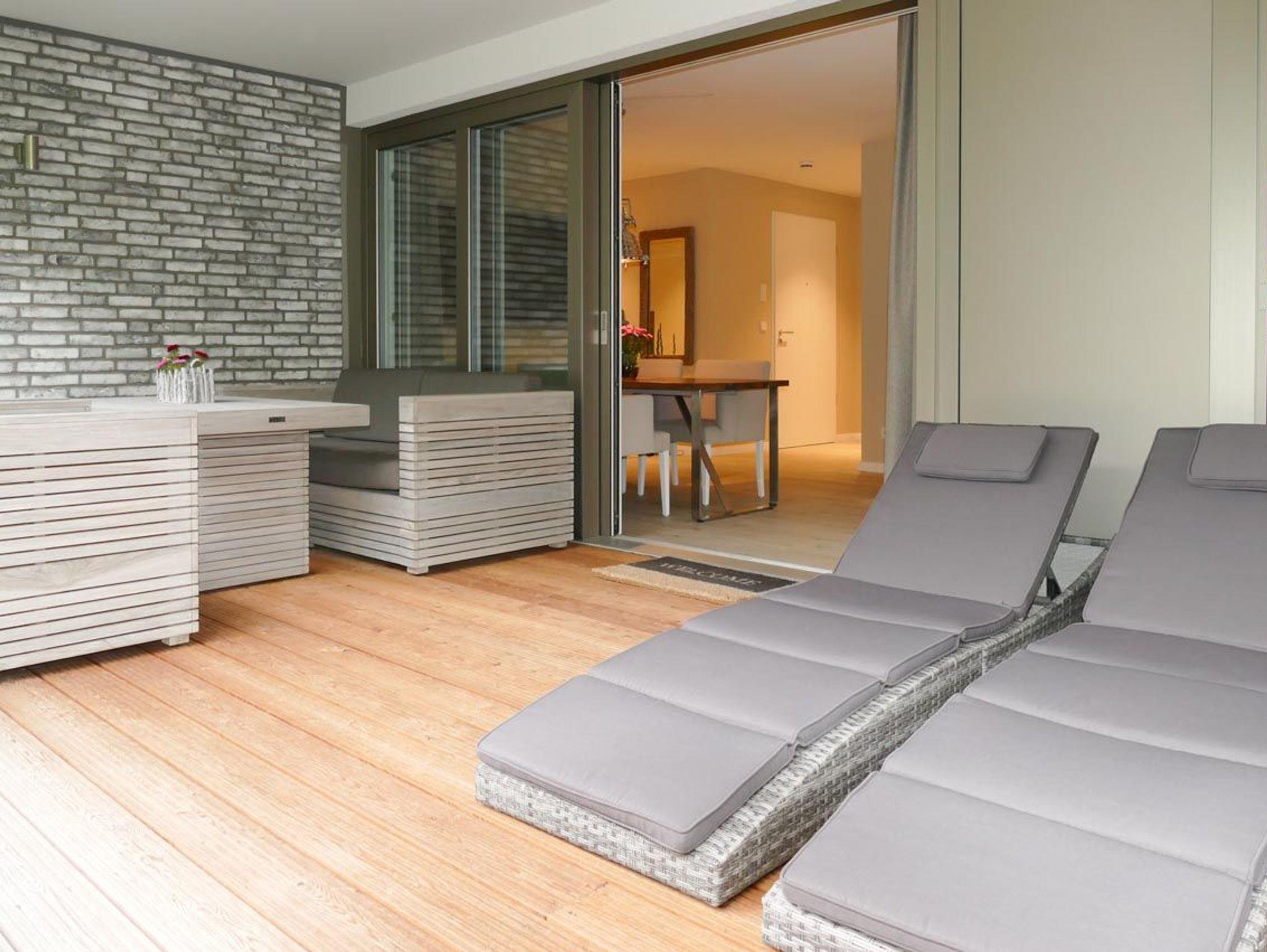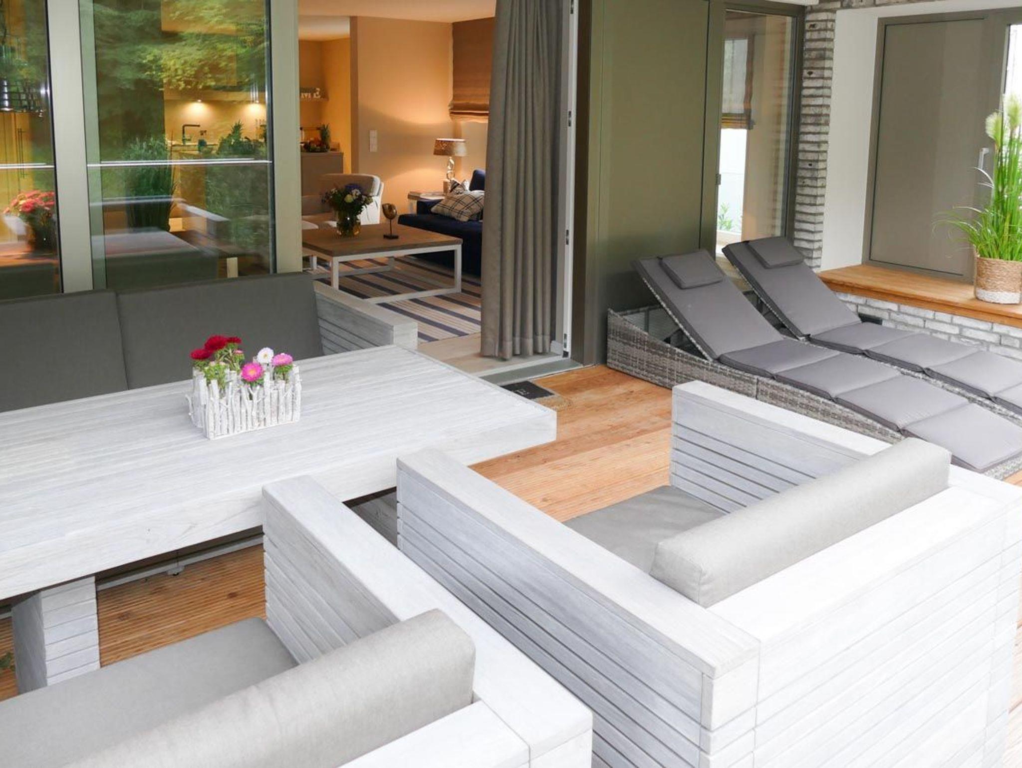 Der moderne, offen gestaltete Küchen-/Wohnbereich mit angrenzendem Essbereich integriert mittels eines Schiebeelements den großen Südwestbalkon, ausgestattet mit loungartigen Gartenmöbeln und Sonnenliegen. Ein exklusives Wohnerlebnis der besonderen Art! Es stehen zwei separate Schlafzimmer mit hochwertigen Boxspringbetten (180x200) und TV sowie zwei moderne Bäder zur Verfügung.