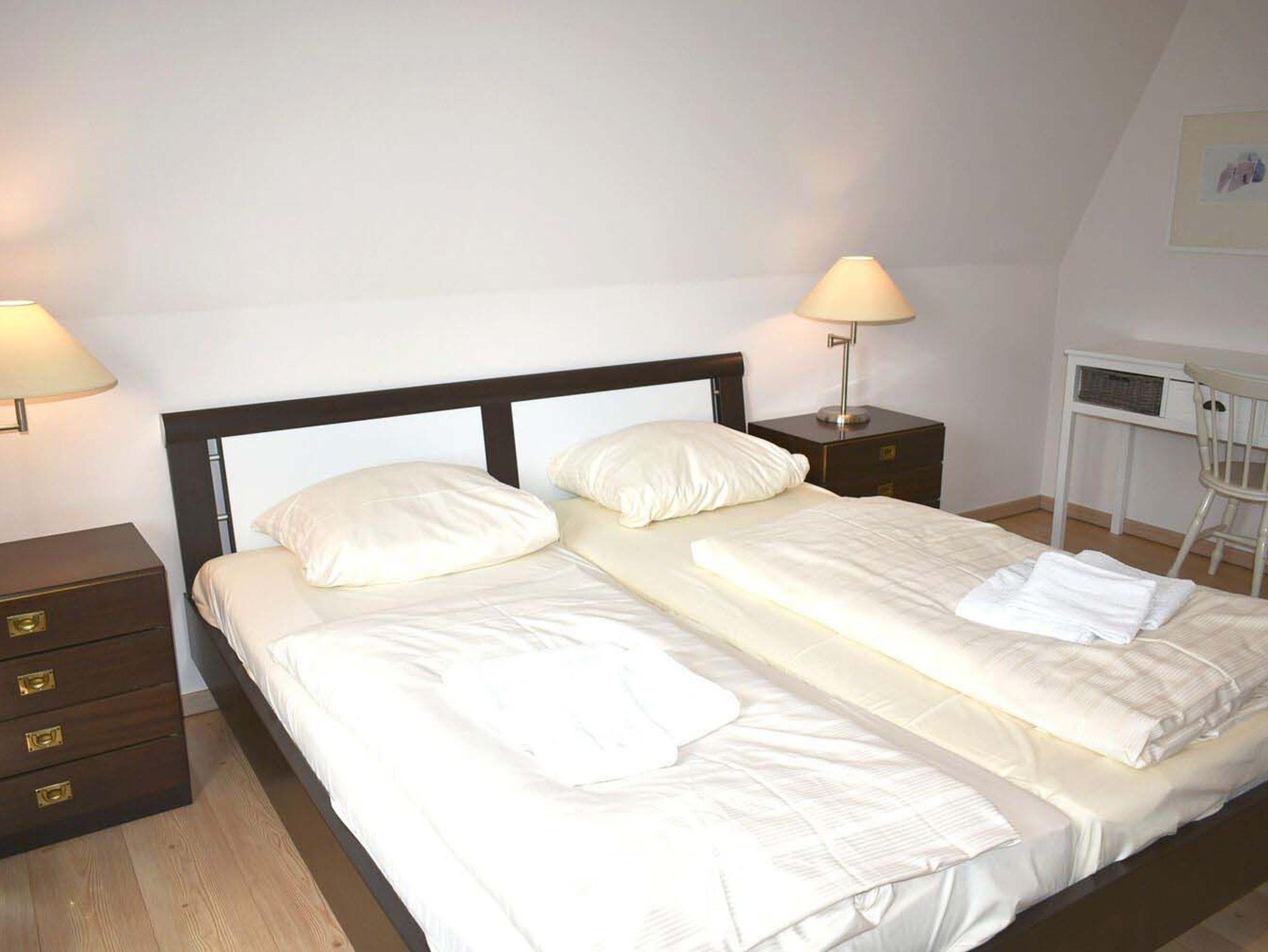 Schlafzimmer 1: 2 Matratzen, 2 Sessel, 3 Nachttische, Doppelbett 2,00 x 1,80 m, Kleiderschrank, Radiowecker, Spiegel, Verdunklungsstores