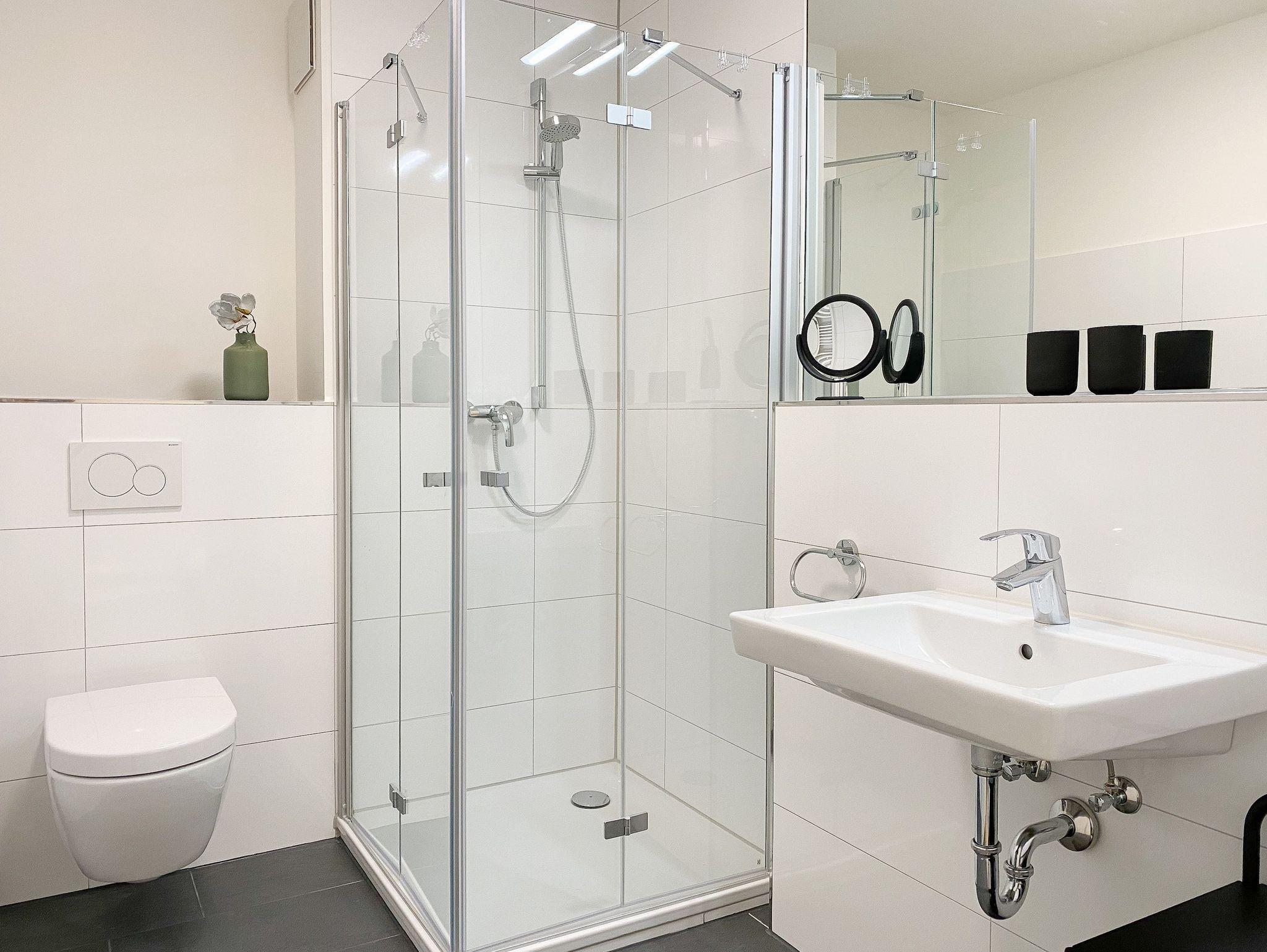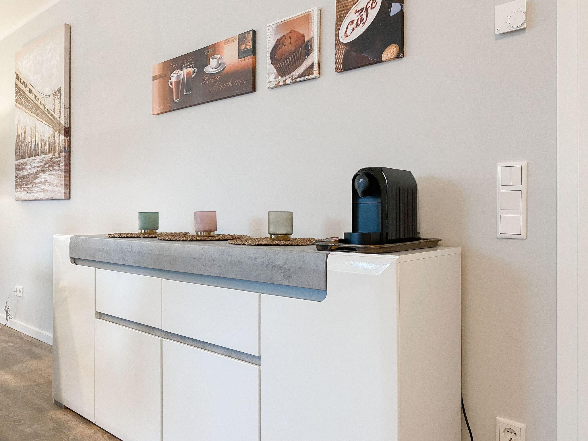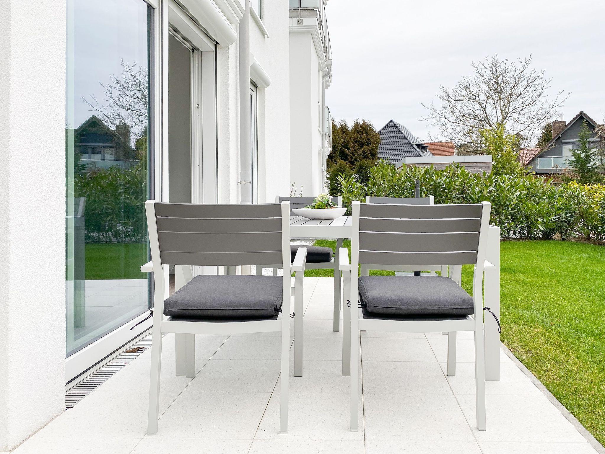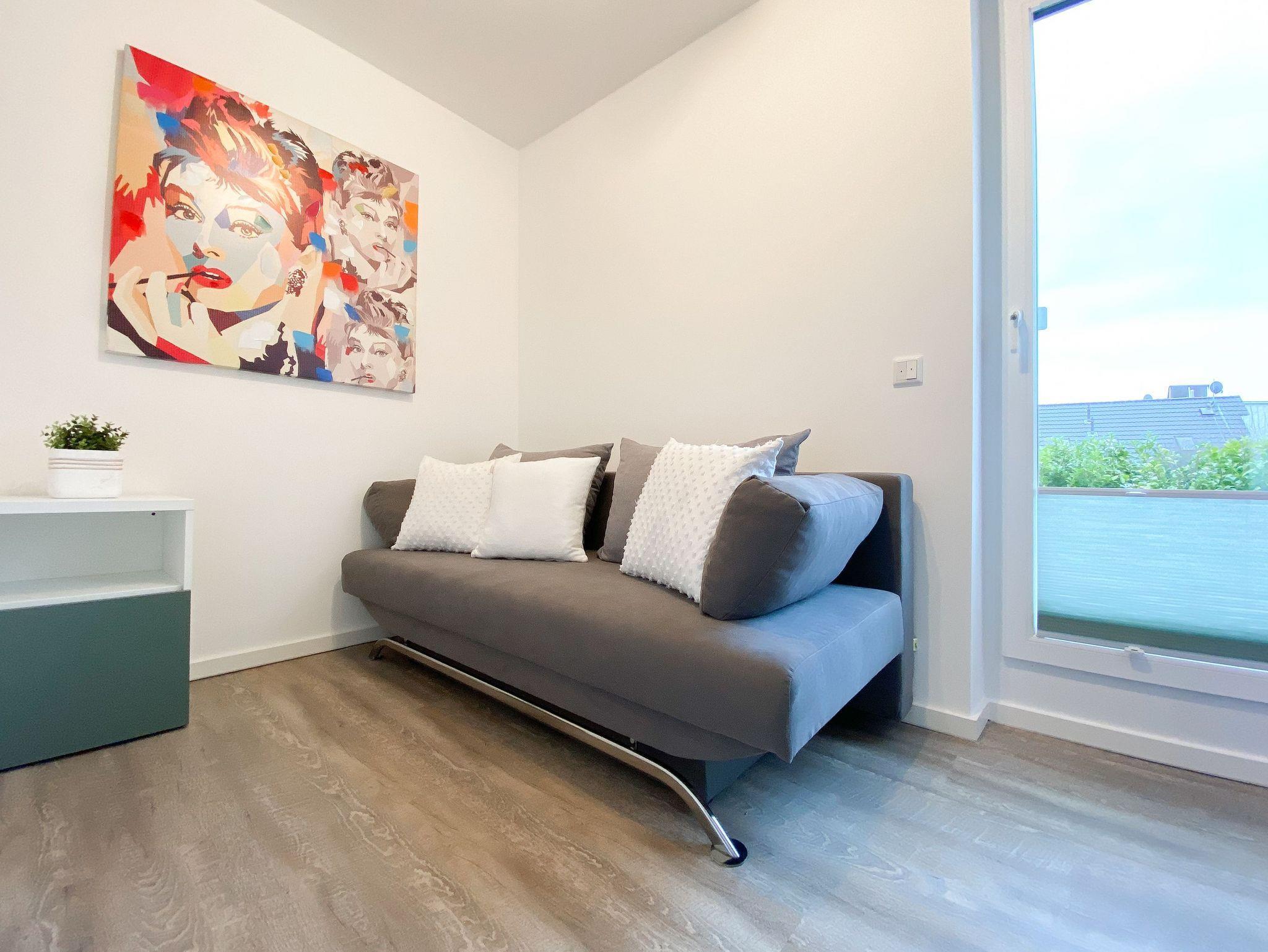 Die großzügig geschnittene Erdgeschosswohnung bietet auf ca. 60 qm Wohnfläche genügend Platz für 4 Personen, um einen entspannten Urlaub zu verleben. Sämtliche Annehmlichkeiten eines Neubaus wie bodentiefe Fenster, Fußbodenheizung und elektrische Außenjalousien sorgen für helle Räumlichkeiten und eine angenehmes Raumklima. Zur Verfügung stehen zwei separate Schlafzimmer, eingerichtet mit einem Doppelbett (180x200) und einem Schlafsofa (140x200) sowie ein modernes Bad mit Walk In Dusche. Die bestens ausgestattete Einbauküche ist direkt mit dem großzügigen Wohn- Essbereich verbunden. Auf der möblierten Terrasse in Südausrichtung können Sie die Sonnentage von früh bis spät an der frischen Luft genießen. Selbstverständlich gehören die kostenlose WLAN Nutzung, Radio und TV zur Ausstattung.