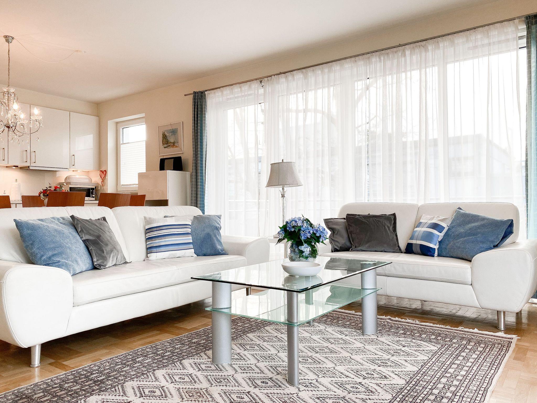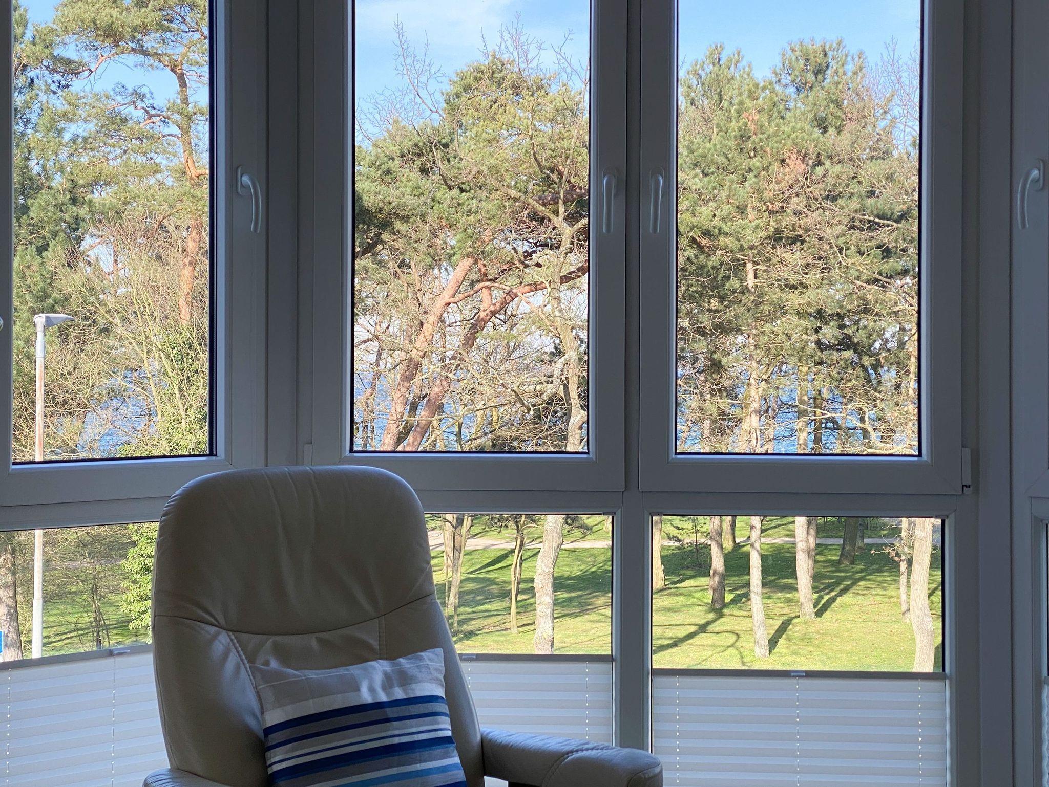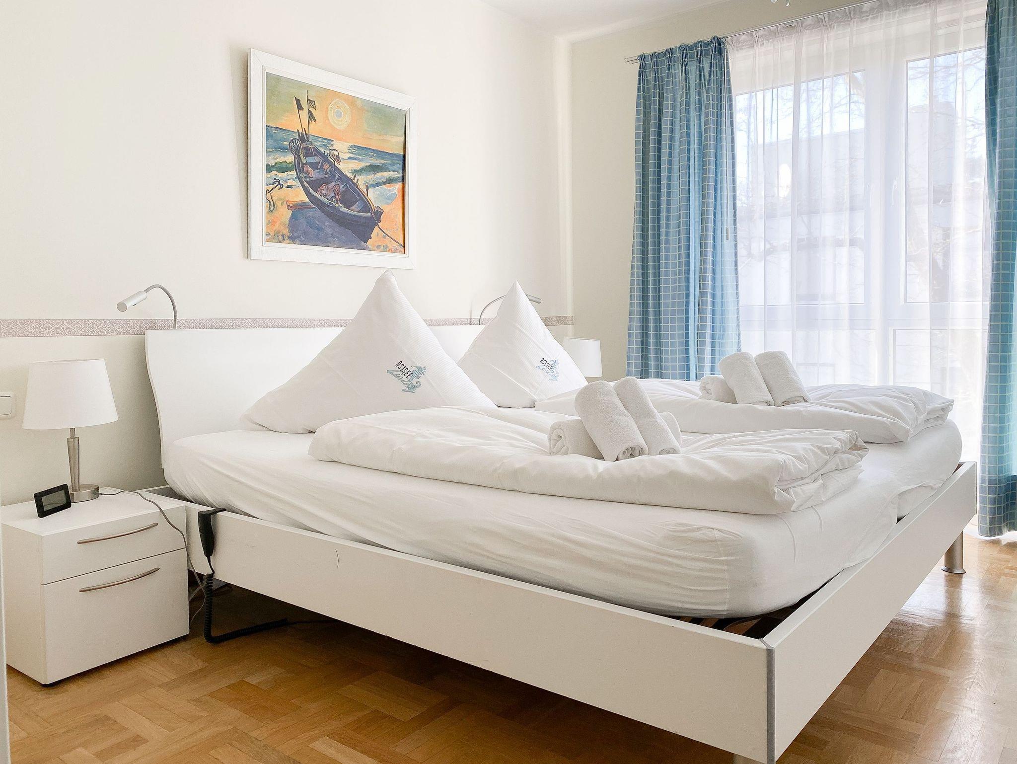 Die komfortable Wohnung im 2. Obergeschoss bietet mit 2 separaten Schlafzimmern, ausgestattet mit Doppelbett (180x200) mit elektrisch verstellbaren Rahmen und zwei Einzelbetten (90x200)[nbsp][nbsp]sowie 2 separaten Duschbädern ausreichend Platz für 4 Personen. In einem der Bäder ist zusätzlich eine Waschmaschine untergebracht. Es gibt eine offene, moderne Einbauküche mit Induktionsherd, Backofen, Mikrowelle, Geschirrspüler und einen großzügigen Essbereich für 6 Personen. Der anschließende Wohnbereich ist mit einer Ledergarnitur und einem Elektrokamin ausgestattet und eröffnet einen wunderschönen Ausblick über den gegenüberliegenden Park, teilweise durch das Grün bis zur Ostsee. Im Erker befindet sich ein gemütlicher Lesesessel. Auf dem vorgelagerten Balkon läßt sich wunderbar die Abendsonne bei einem Sundowner genießen. Ein kostenloser Internetzugang über WLAN steht zur Verfügung.