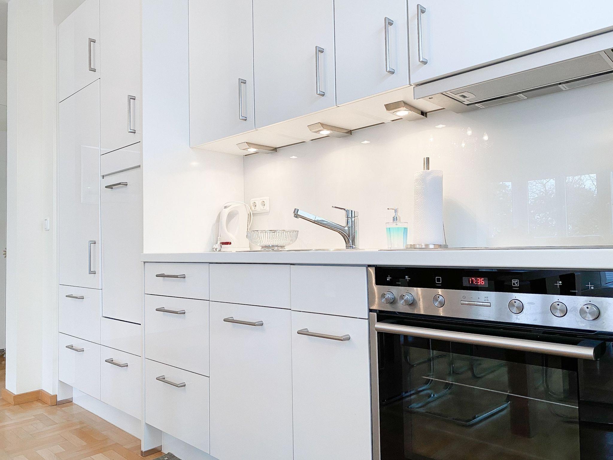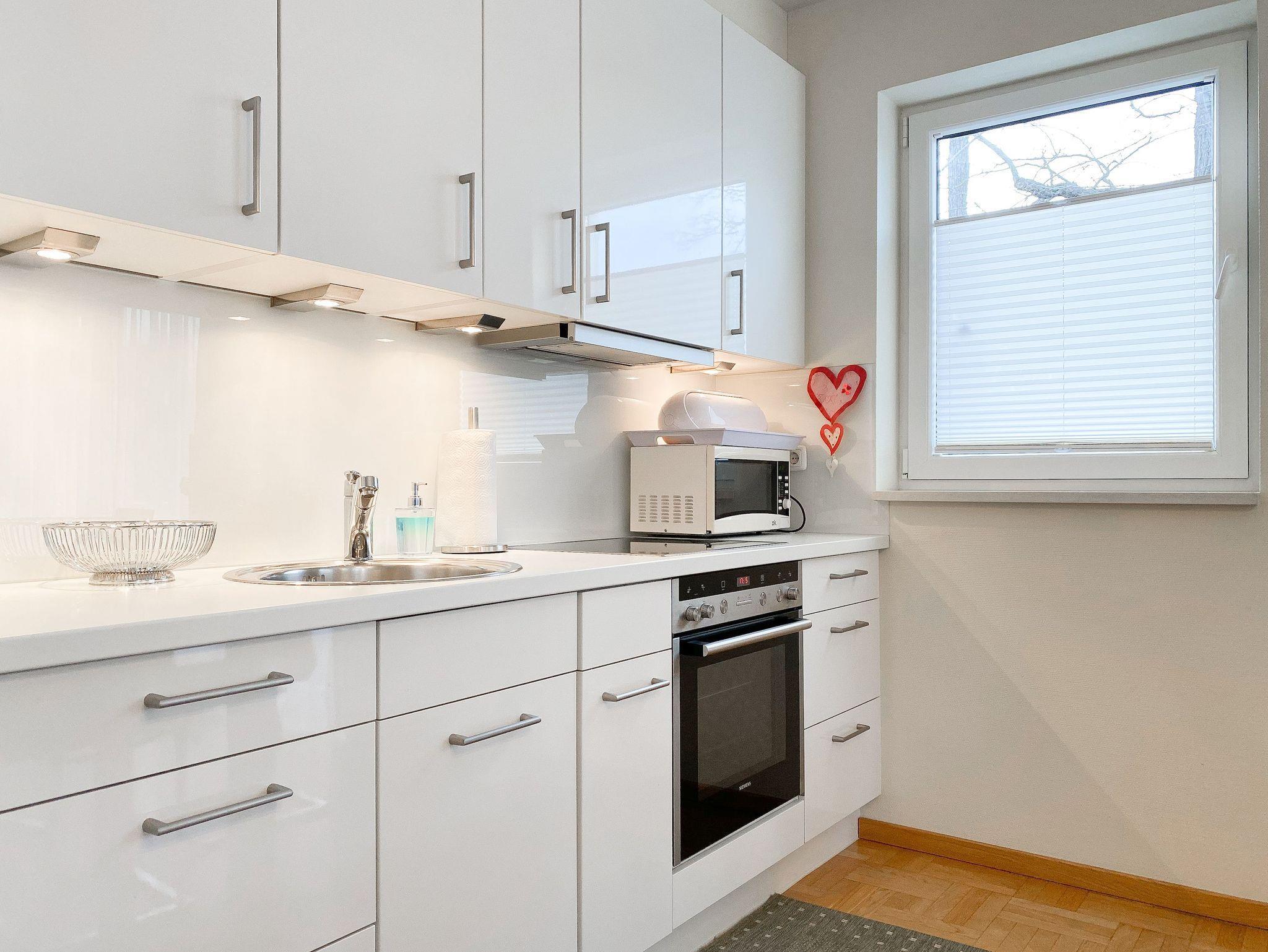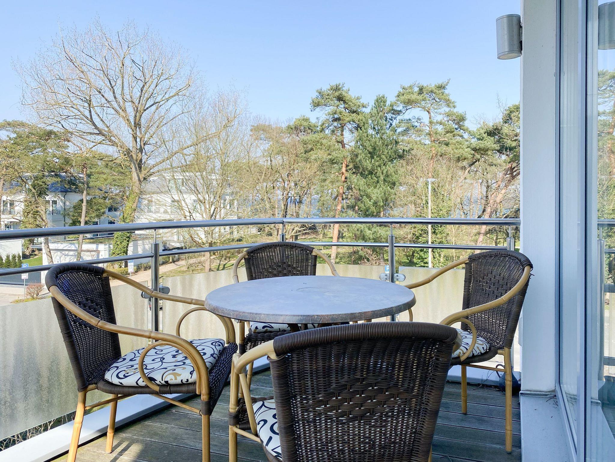 Die komfortable Wohnung im 2. Obergeschoss bietet mit 2 separaten Schlafzimmern, ausgestattet mit Doppelbett (180x200) mit elektrisch verstellbaren Rahmen und zwei Einzelbetten (90x200)[nbsp][nbsp]sowie 2 separaten Duschbädern ausreichend Platz für 4 Personen. In einem der Bäder ist zusätzlich eine Waschmaschine untergebracht. Es gibt eine offene, moderne Einbauküche mit Induktionsherd, Backofen, Mikrowelle, Geschirrspüler und einen großzügigen Essbereich für 6 Personen. Der anschließende Wohnbereich ist mit einer Ledergarnitur und einem Elektrokamin ausgestattet und eröffnet einen wunderschönen Ausblick über den gegenüberliegenden Park, teilweise durch das Grün bis zur Ostsee. Im Erker befindet sich ein gemütlicher Lesesessel. Auf dem vorgelagerten Balkon läßt sich wunderbar die Abendsonne bei einem Sundowner genießen. Ein kostenloser Internetzugang über WLAN steht zur Verfügung.