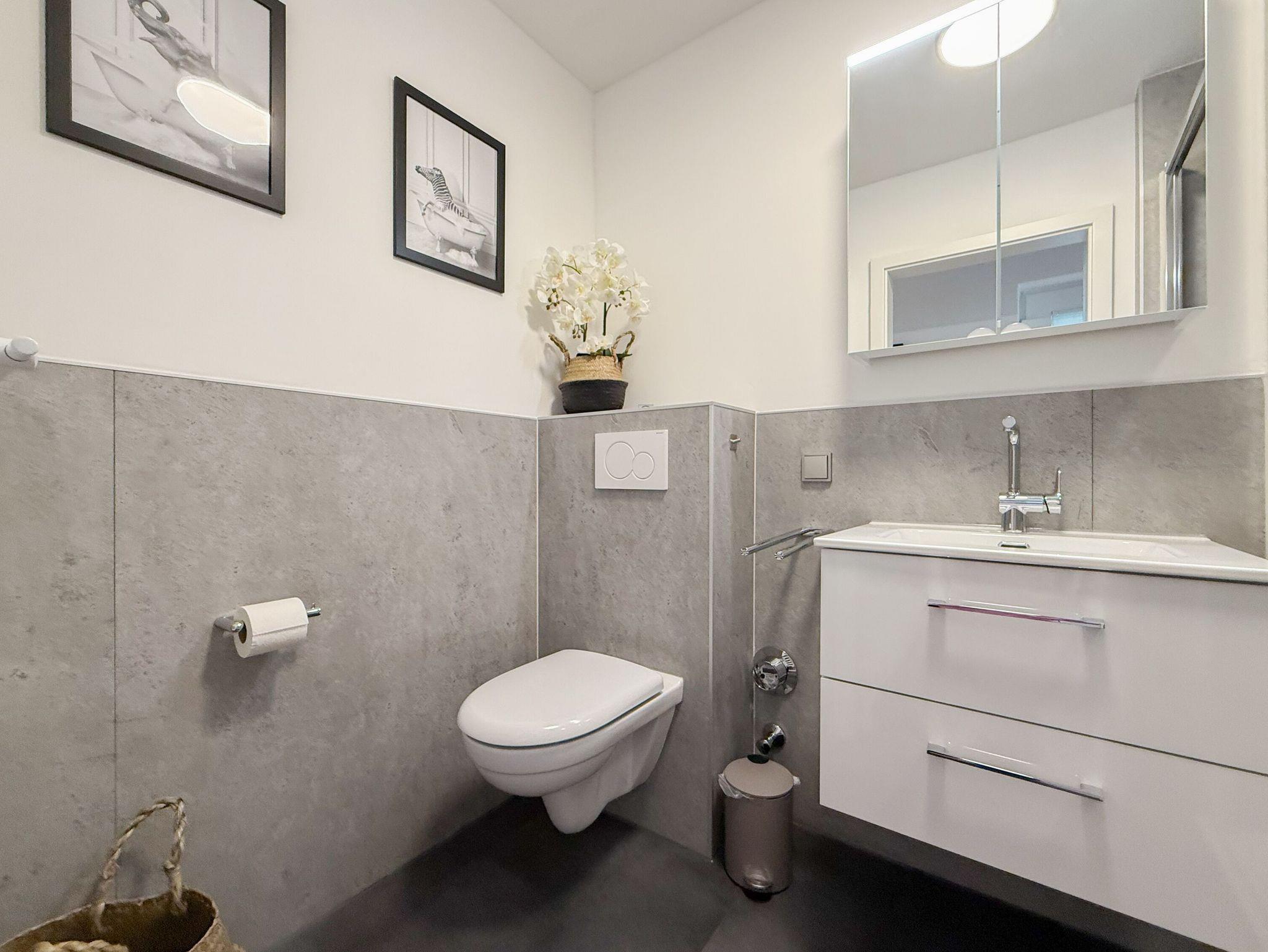 Das Schlafzimmer ist mit einem Doppelbett (160x200) und einem geräumigen Kleiderschrank eingerichtet.[nbsp] Sämtliche Fenster verfügen über Plissees und Vorhänge zur vollständigen Verdunkelung. Alle Fenster sind mit Insektenschutzgittern versehen, jeweils rechtsseitig der Doppelfenster und die Terrassentür. Das neue Duschbad ist modern gestaltet. WLAN steht Ihnen selbstverständlich zur Verfügung.