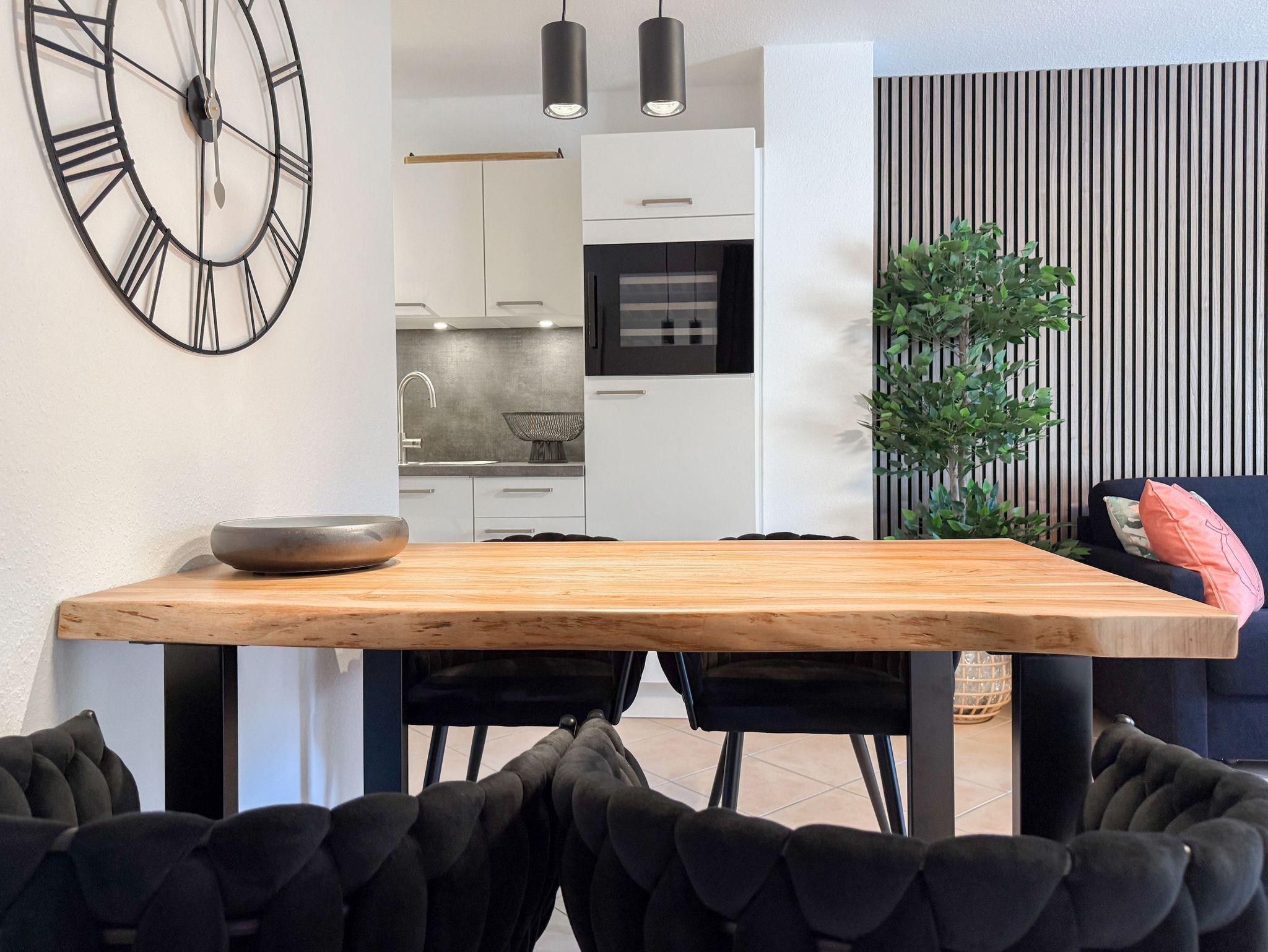 Die hochwertig eingerichtete und bestens ausgestattete Ferienwohnung eignet sich ideal für 3 Personen, die ihren Urlaub in stilvollem Ambiente genießen möchten. Die Terrassenwohnung mit separatem Eingang liegt am Rand der gepflegten Wohnanlage Gorch Fock Park und garantiert Ruhe sowie Privatsphäre. Der Wohnbereich überzeugt durch ein komfortables Sofa mit Schlaffunktion, Smart-TV und Bluetooth-Radio. Der anschließende Essbereich bietet ausreichend Platz, und die offene, neu integrierte Küche fügt sich harmonisch in den Raum ein. Sie ist unter anderem mit Weinkühlschrank, Spülmaschine, Backofen, Induktionsherd, Gefriermöglichkeit und vielem mehr ausgestattet. Genießen Sie sonnige Stunden auf der Südterrasse, die mit einer elektrischen Markise sowie Gartenmöbeln ausgestattet ist.