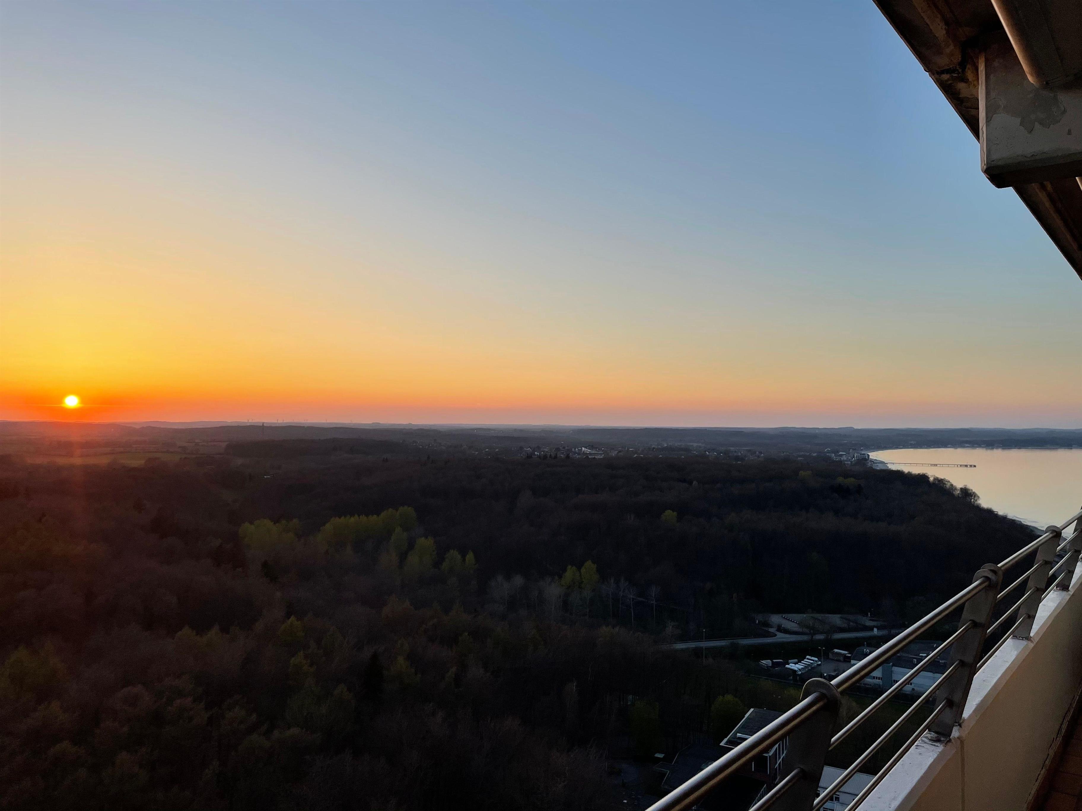 Vom Wohnzimmer und Schlafzimmer aus hat man Zutritt zum großen Westbalkon mit Blick über den Wald bis hin zum Meer (seitlich). Dieser ist mit einer Sitzgruppe und einem Liegestuhl ausgestattet.