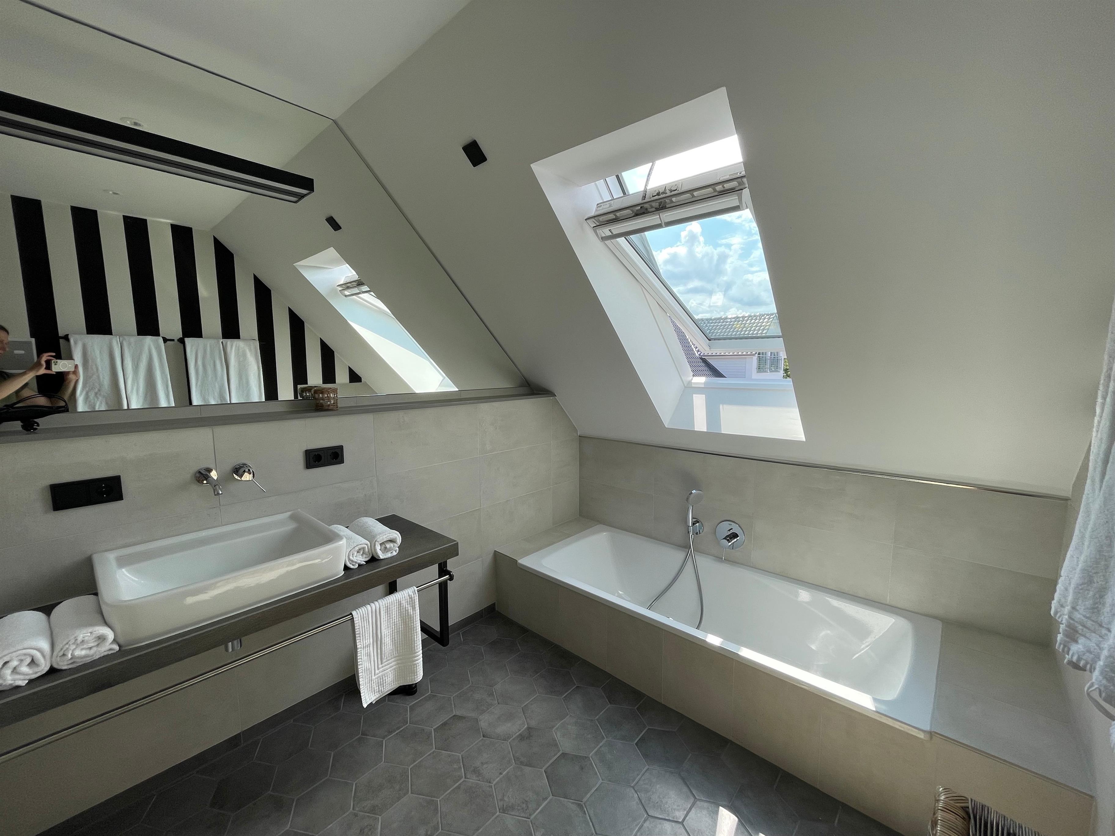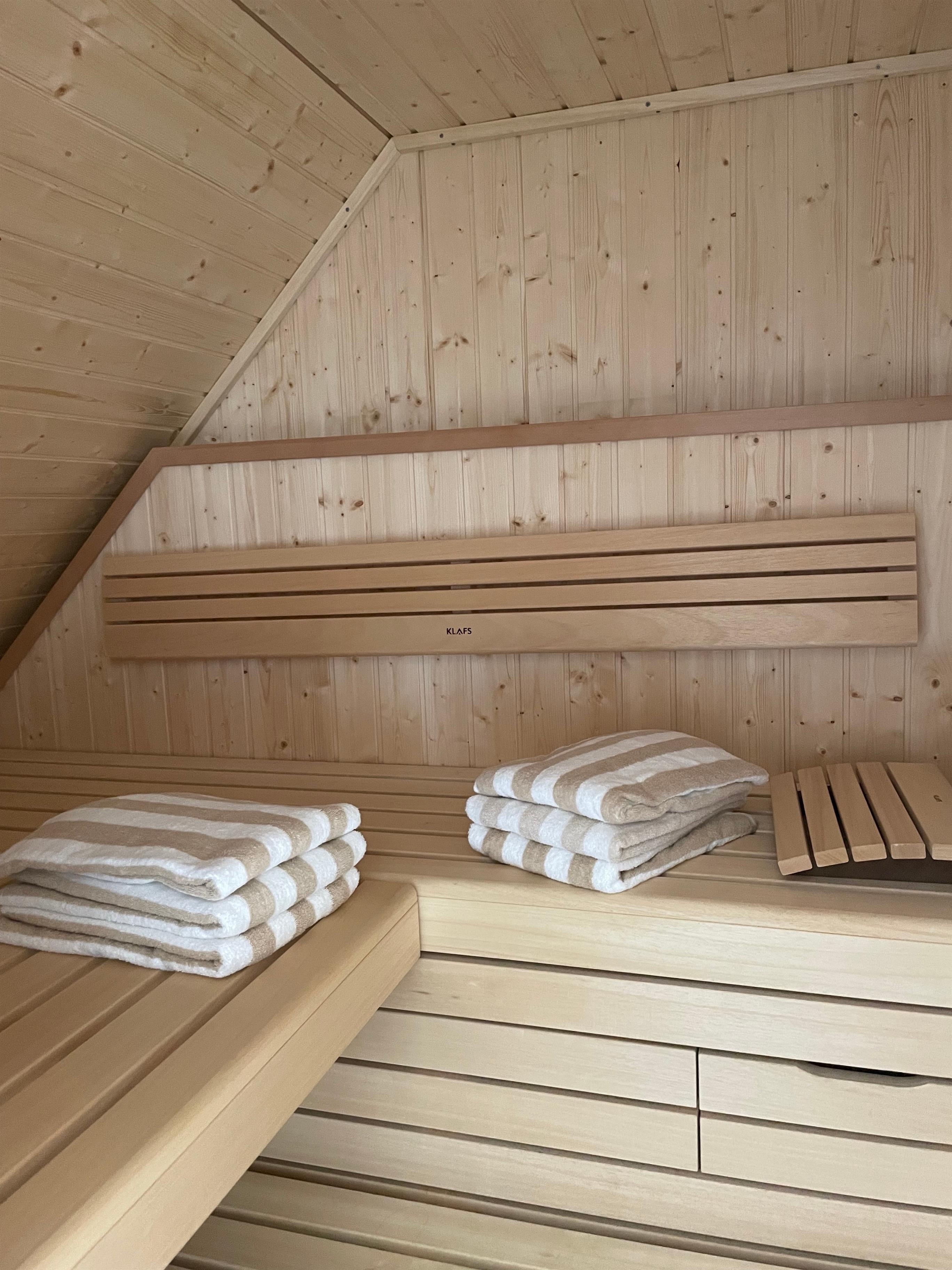 Sie betreten unsere Lotte durch einen Flur mit einer Garderobe. Vom Flur gehen das Wohnzimmer, das Schlafzimmer, ein Alkoven, ein separates WC sowie das Badezimmer ab. Im Wohnbereich befindet sich eine vollausgestattete Einbauküche mit Essbereich für vier Personen, ein kuscheliges Hussensofa, ein Sessel und ein Flachbild-TV. Vom Wohnzimmer aus kommen Sie auf den Balkon mit Süd-West-Ausrichtung, auf dem Sie ein kleiner Tisch und Stühle erwarten. Hier können Sie den ersten Kaffee des Tages oder am Abend einen erfrischenden Sundowner genießen. Das Schlafzimmer verfügt über ein gemütliches Boxspringbett, zwei große Kleiderschränke mit einem Zimmersafe und einen Flachbild-TV. Entschleunigen können Sie im separaten Badezimmer mit integriertem Internet-Radio, Badewanne, einer Regendusche sowie als Highlight in der eigenen finnischen Sauna von Klafs. Die hochwertige Einrichtung umfasst u. a. Möbel von Riviera Maison. Ein kleiner Abstrellraum rundet die Wohnung ab.