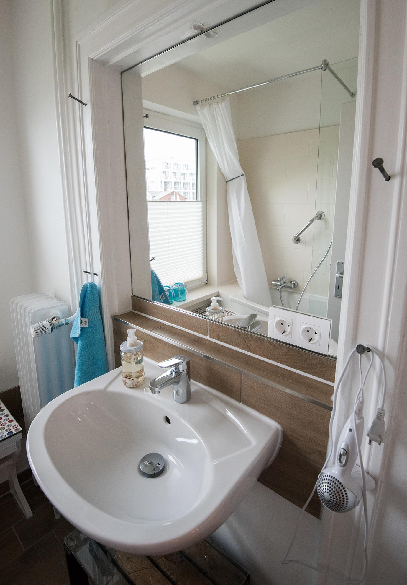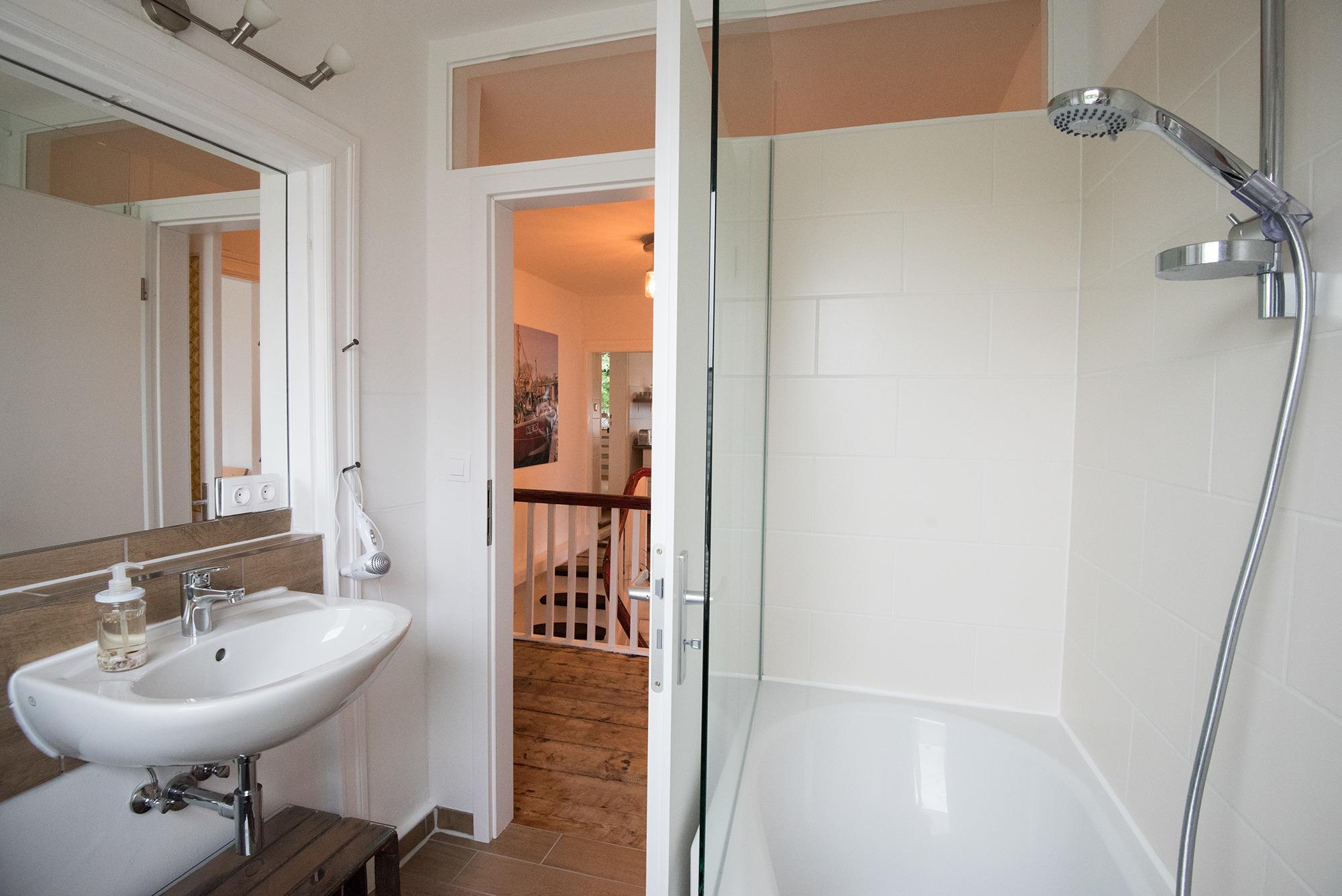 Genießen Sie Ihre Ferien in vollen Zügen, bei schönem Wetter auch gerne draußen auf der Gemeinschaftsterrasse. Das Badezimmer ist ausgestattet mit einer modernen Duschbadewanne und einem Haartrockner.