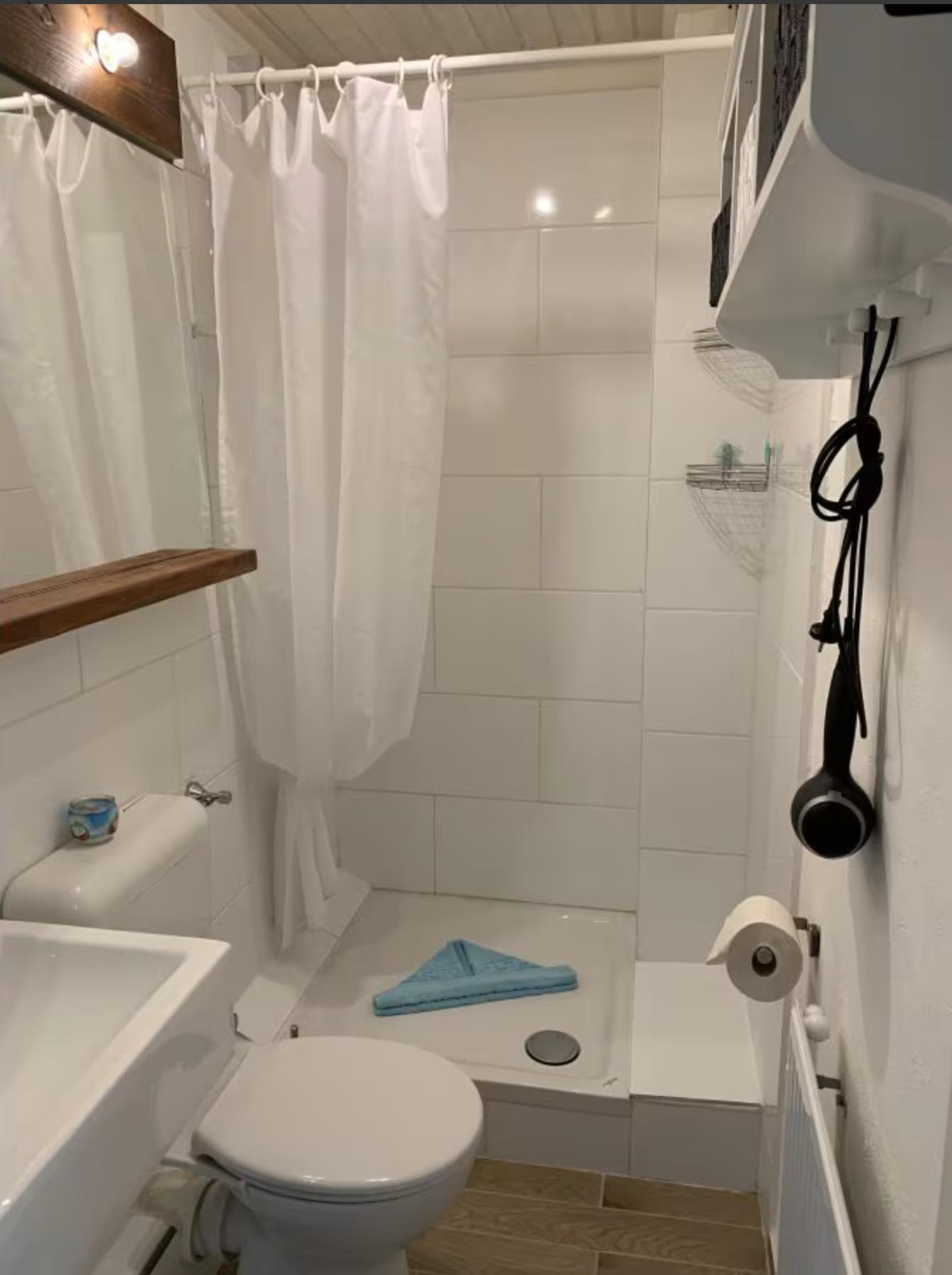 Das Badezimmer ist ausgestattet mit einer modernen Dusche und einem Haartrockner.