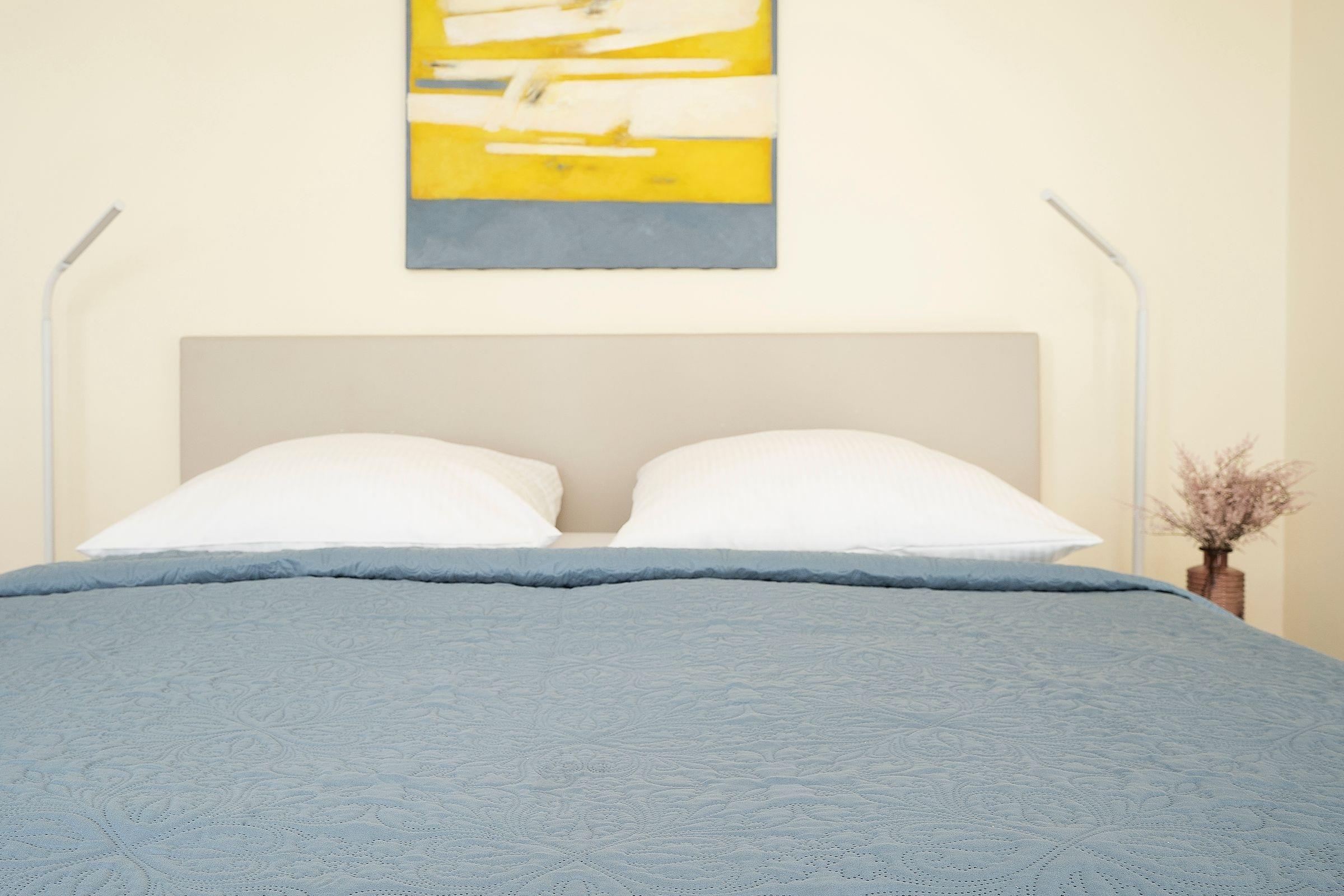Schlaf-/Wohnzimmer: Boxspringbett (180x200 cm), Kleiderschrank, Platz für Kinderreisebett vorhanden, Sichtschutz (Gardinen), TV