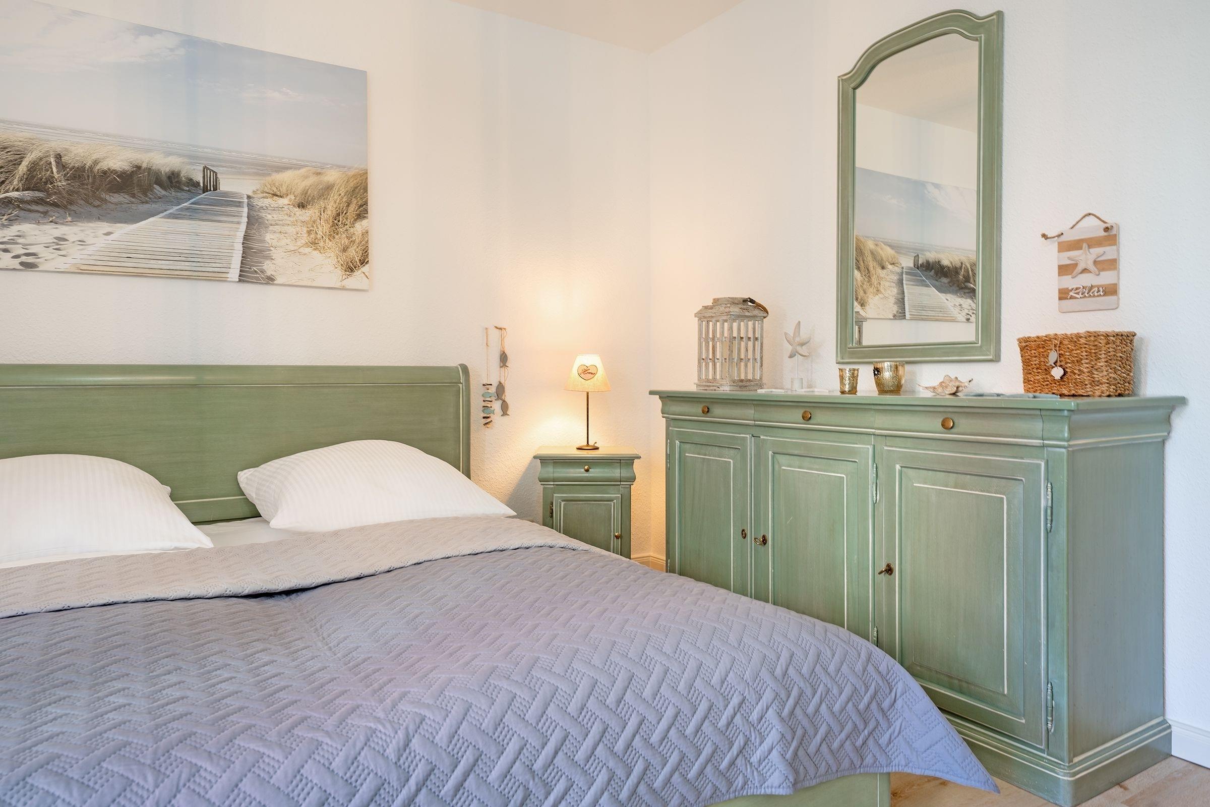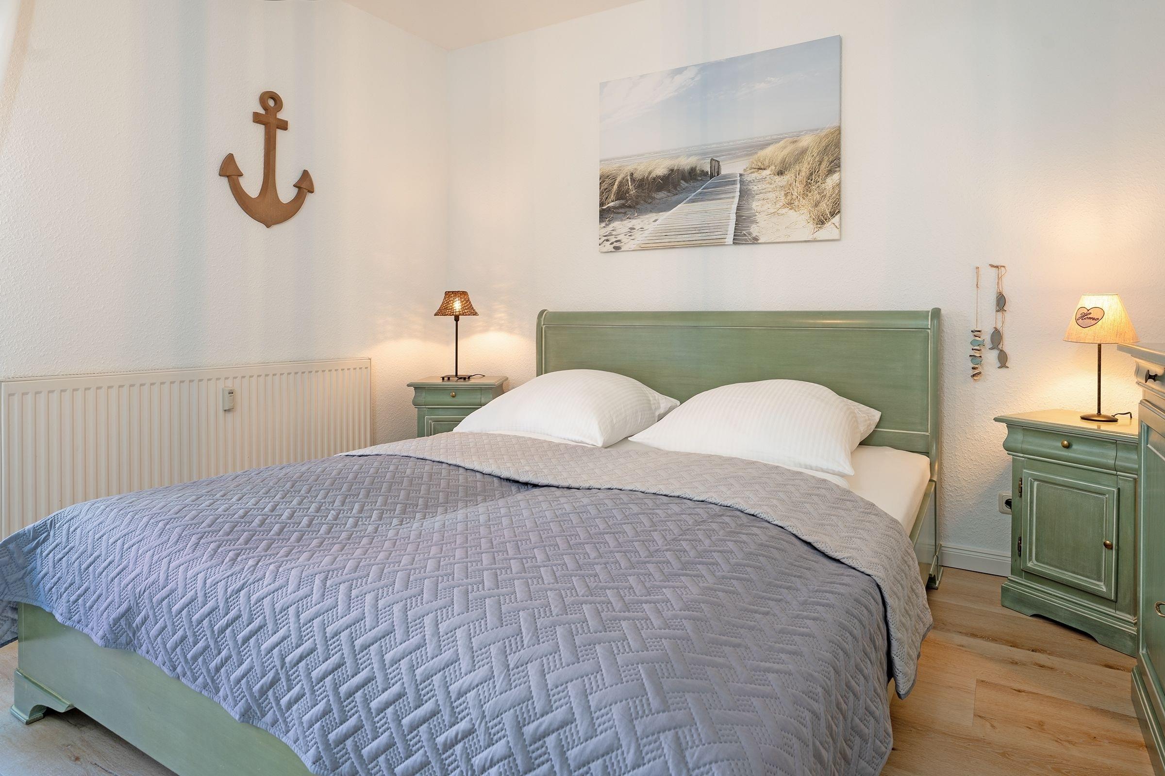Ein weiteres Highlight der Wohnung ist das liebevoll gestaltete und großzügige Schlafzimmer, das mit einem bequemen Doppelbett (2x 90x200 cm) für einen geruhsamen Schlaf sorgt. Nach Norden ausgerichtet ist es auch im Sommer stets angenehm kühl - Ihre Kleidung findet im geräumigen Kleiderschrank Platz. Schön sind die bodentiefen Fenster, verdunkelt wird mit elektrischen Außenjalousien. Das schicke, taghelle Duschbad mit Föhn und Kosmetikspiegel lässt Sie bestimmt mit einem Lächeln in den neuen Tag starten.
