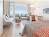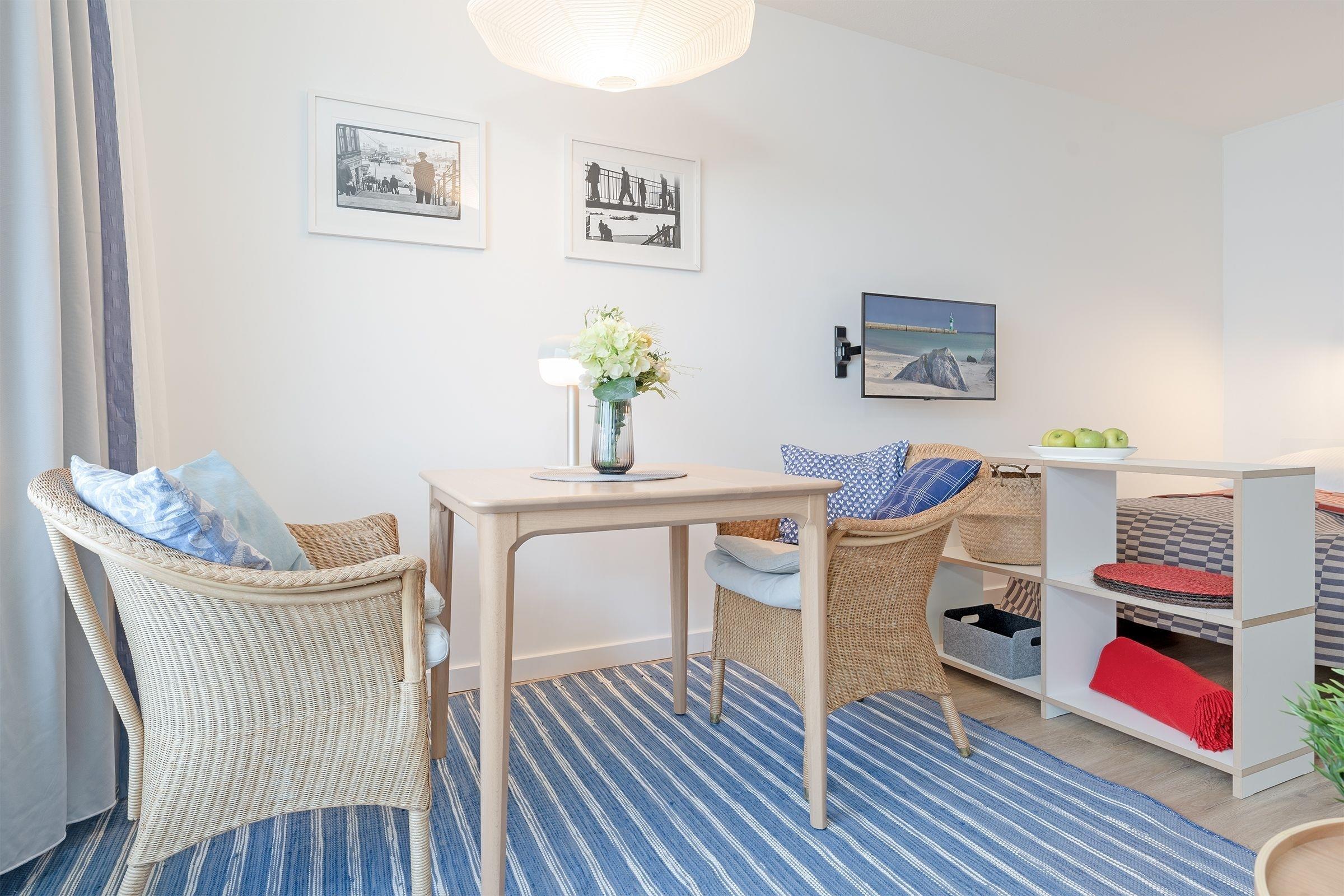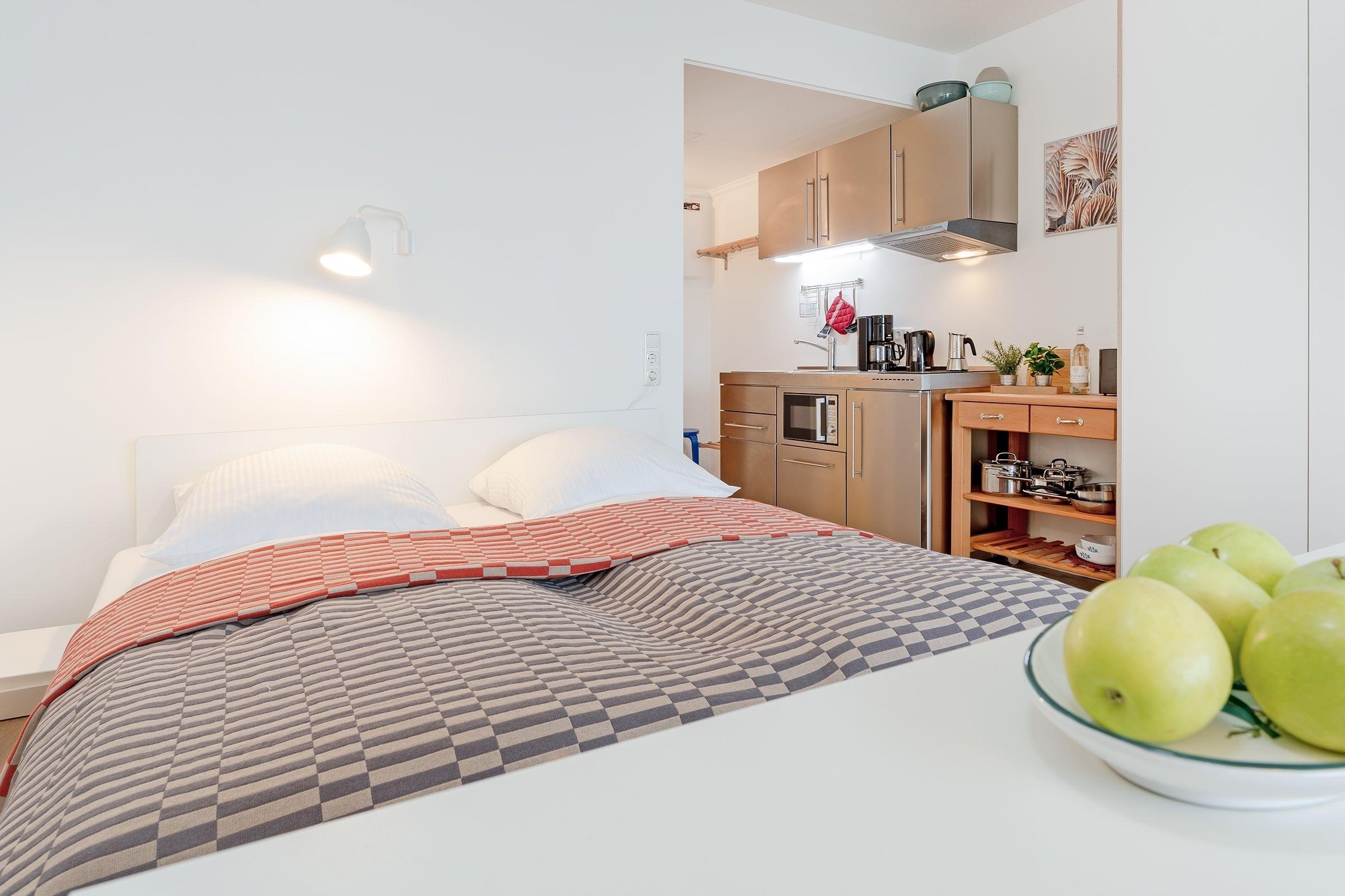 Mit dem Fahrstuhl geht es hoch bis in die 17. Etage. Hier ist Meer wirklich mehr, denn der Ausblick aus diesem Urlaubsparadies ist phänomenal und begleitet Sie vom Aufstehen bis zum Abend. Der Wohn-, Ess- und Kochbereich ist offen gestaltet und bietet alles, um sich vom Alltag zu erholen. Auf dem gemütlichen Sofa können Sie einfach mal die Füße hochlegen, auf dem möblierten Balkon mit Meerblick können Sie stundenlang in der mitgebrachten Reiselektüre schmökern und falls Ihr Magen knurrt, haben Sie in der kleinen Küchenzeile mit 2 Induktionsherdplatten die Möglichkeit, Ihren Hunger zu stillen. Nach einem langen Strandspaziergang können Sie sich sorglos in die Kissen des komfortablen Doppelbettes (ca. 2x 90x200cm) fallen lassen und vom kommenden Urlaubstag träumen. Im modernen, hellen Bad starten Sie erfrischt in den Morgen.