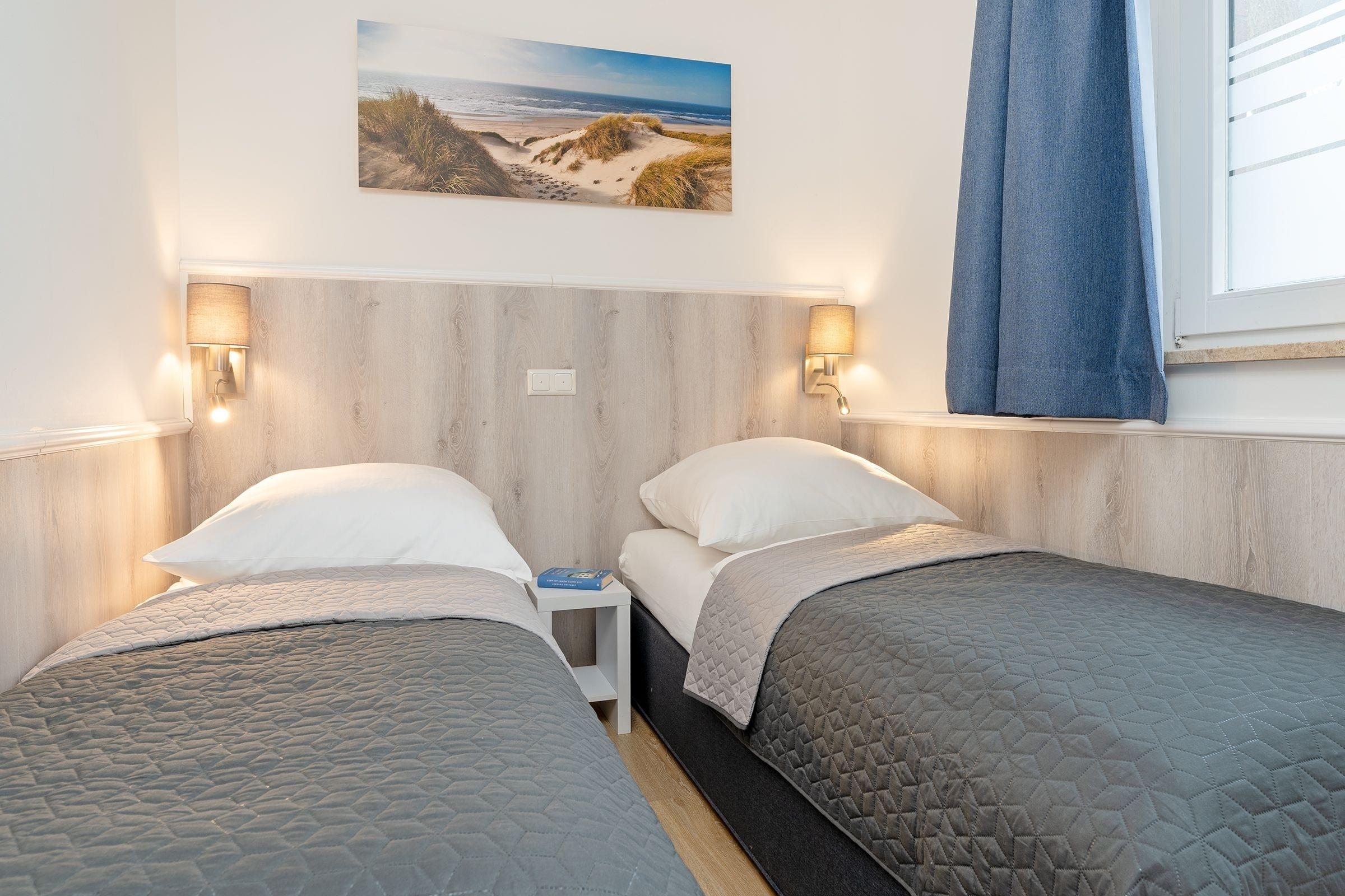 Schlafzimmer: 2 Einzelbetten (je 80x200 cm), Kleiderschrank, TV, Verdunkelung: Gardinen, kein Platz für ein Babybett vorhanden