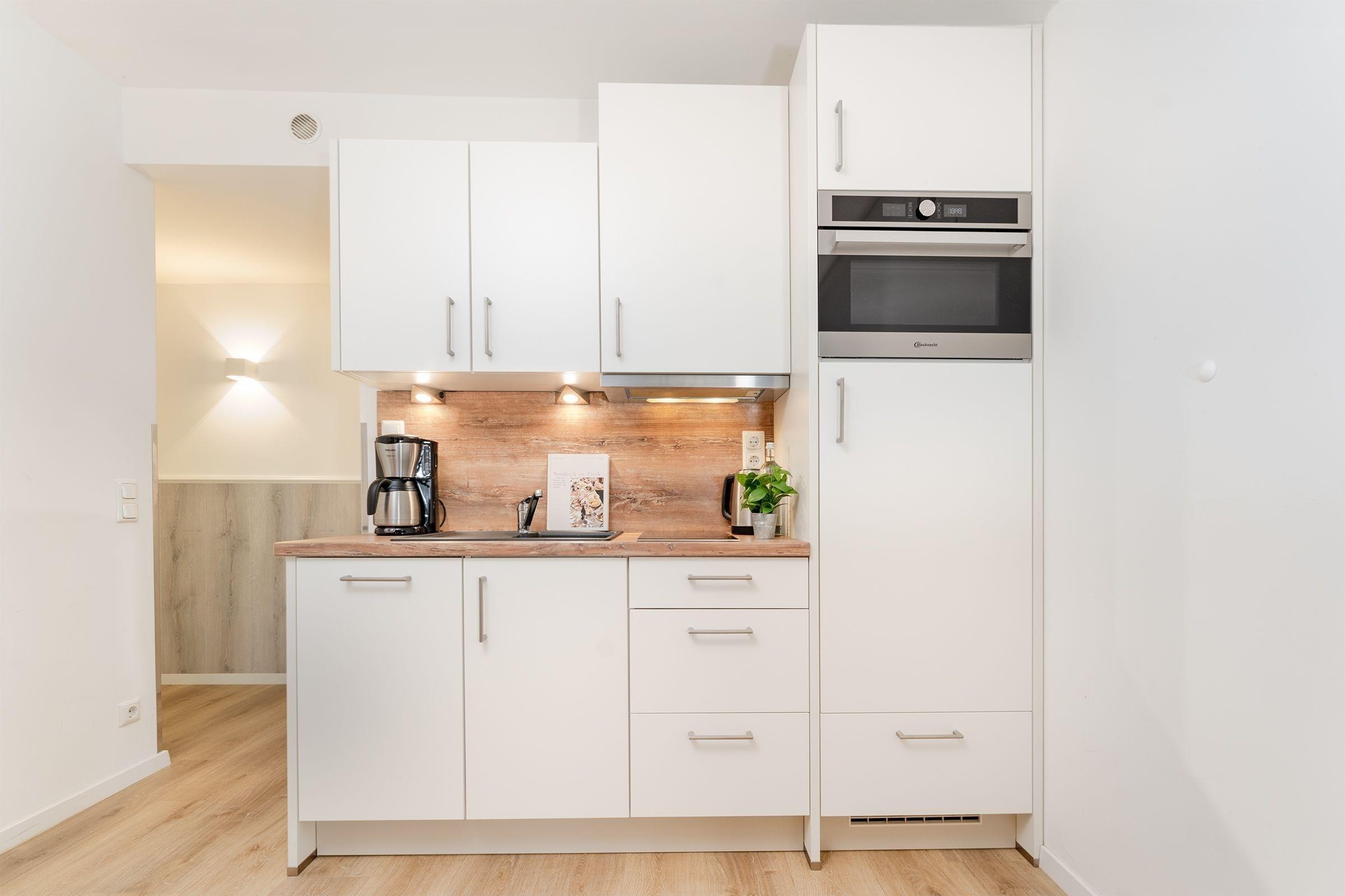 Genießen Sie Ihren Urlaub an der Ostseeküste in modernem Komfort. Die helle Wohnung verfügt über einen gemütlichen Wohnbereich mit Sofa, und TV. Der angrenzende Essbereich und die offene Küche bieten Platz für gemeinsame Mahlzeiten. Die Küche ist gut ausgestattet mit Induktionsherd, Backofen, Spülmaschine, Nespresso-Maschine, Kaffeemaschine, Toaster und Wasserkocher. Vom Wohnbereich aus gelangen Sie auf den überdachten Balkon in Südwestausrichtung – ideal, um die frische Ostseeluft bei jedem Wetter zu genießen. Das Schlafzimmer bietet zwei bequeme Einzelbetten (je 80x200 cm) und ausreichend Stauraum. Darüber hinaus befindet sich ein gemütliches Doppelschrankbett (140x200 cm) im Wohnbereich. Das Badezimmer ist modern eingerichtet und mit einer bodengleichen Dusche sowie einem beheizbaren Handtuchhalter ausgestattet.