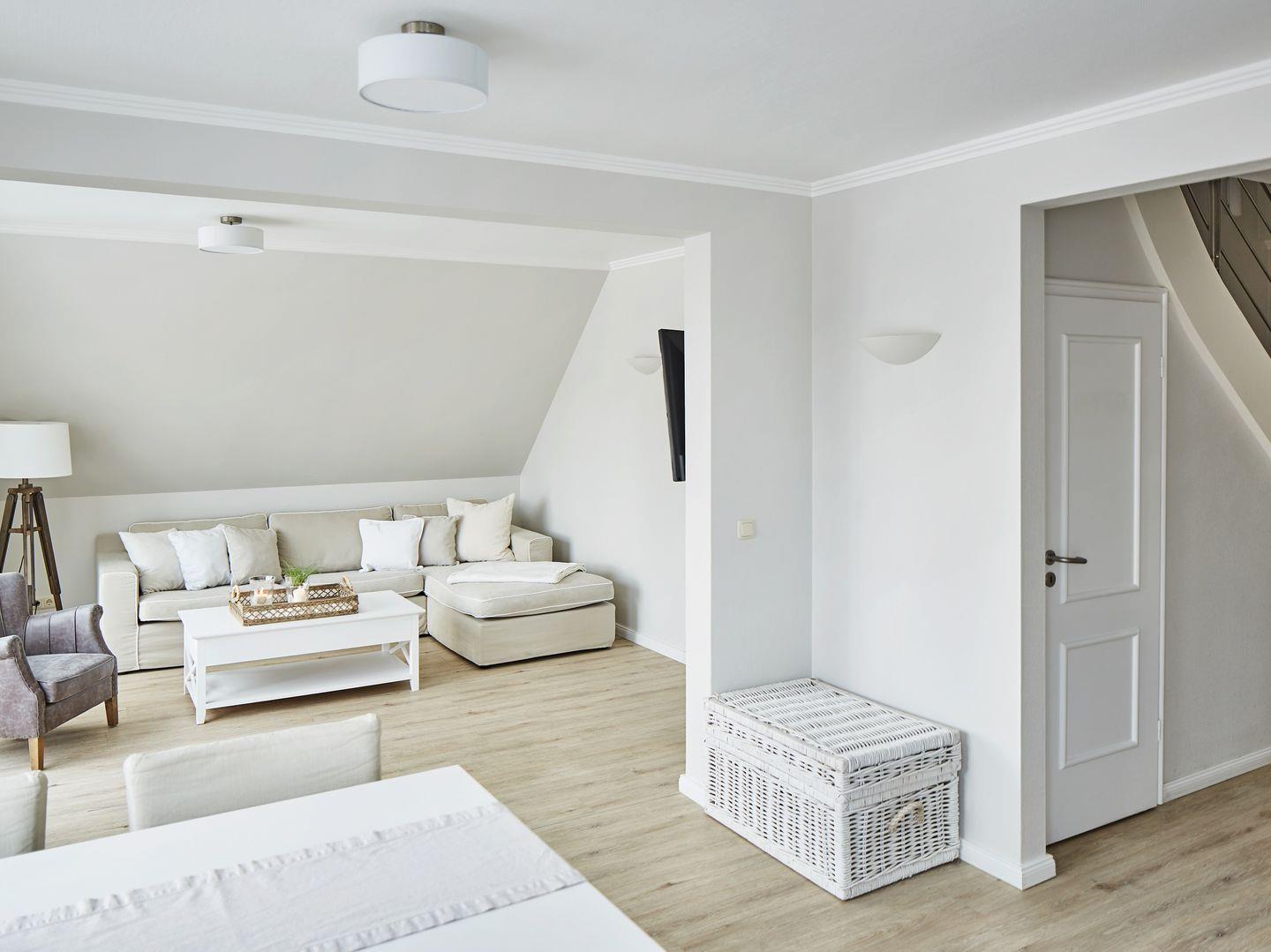 Im unteren Bereich empfängt Sie ein weiter Wohnraum in freundlichen Tönen.