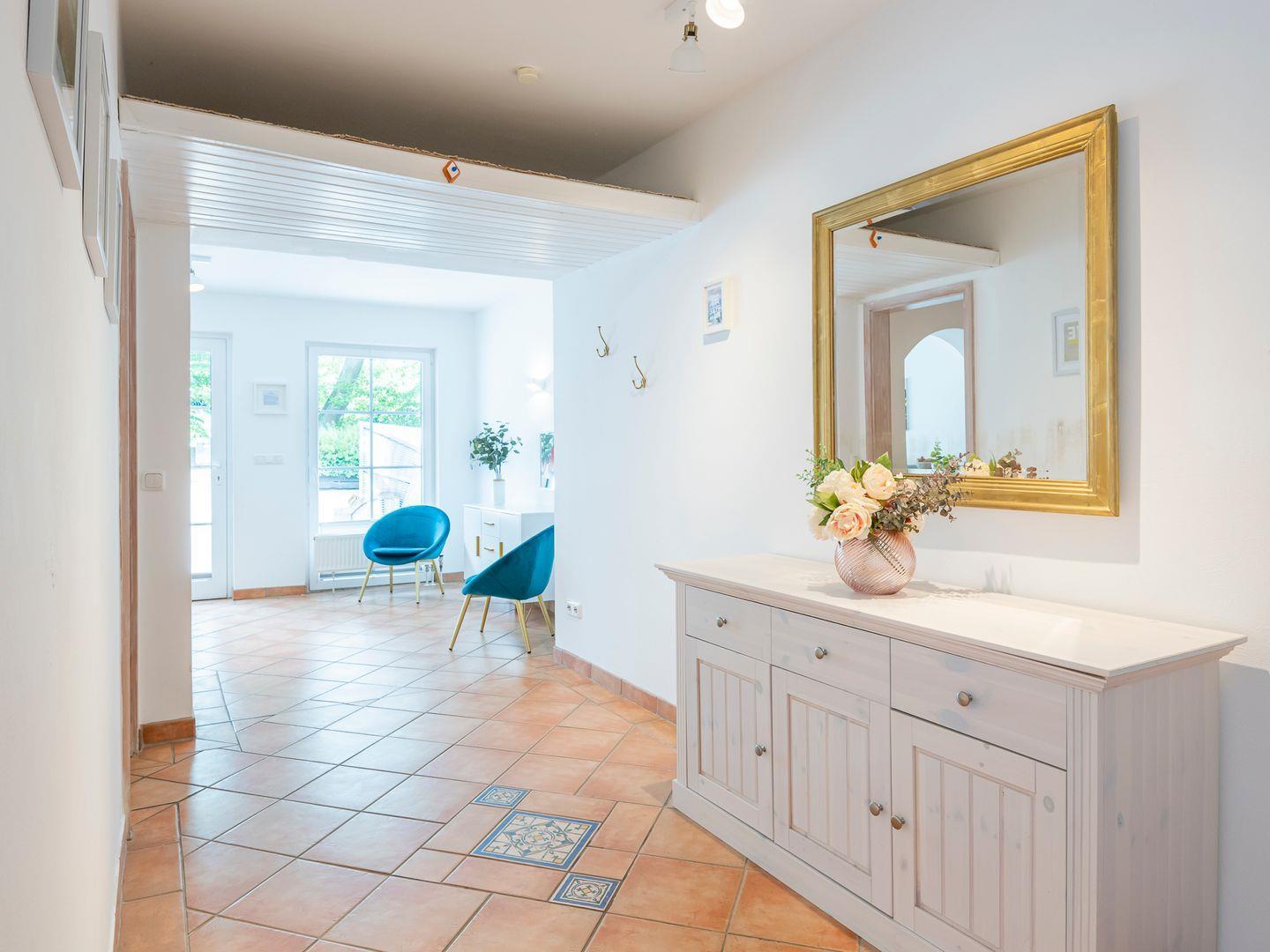 Die Ferienwohnung ist zur Vorderseite des Appartementhauses ausgerichtet und bietet einen angenehmen Ausblick. Im Eingangsbereich zur Ferienwohnung erwartet Sie ein charmantes Philosophenhäuschen, eine Art Strandkorb aus Holz, in dem Sie Ihren ersten Kaffee am Morgen genießen oder entspannt Ihre Urlaubstage ausklingen lassen können.