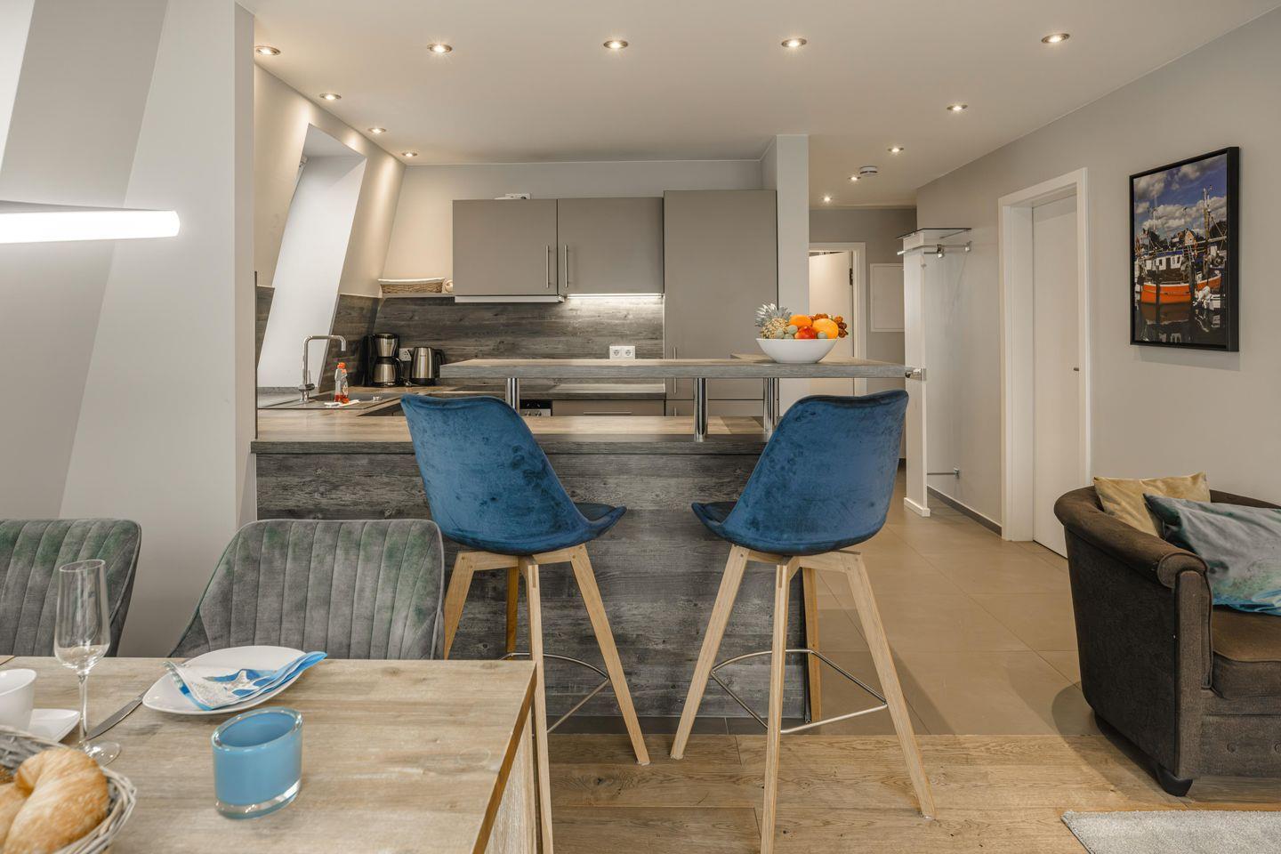 Die Ferienwohnungen Düne und Leuchtturm befinden sich im 2. Obergeschoss und entsprechen vom Schnitt, der Gestaltung und Ausstattung den Ferienwohnungen Strandblick und Strandkorb. Auch sie sind für bis zu vier Personen konzipiert, mit großen Fenstern und Echtholz-Parkettboden ausgestattet.