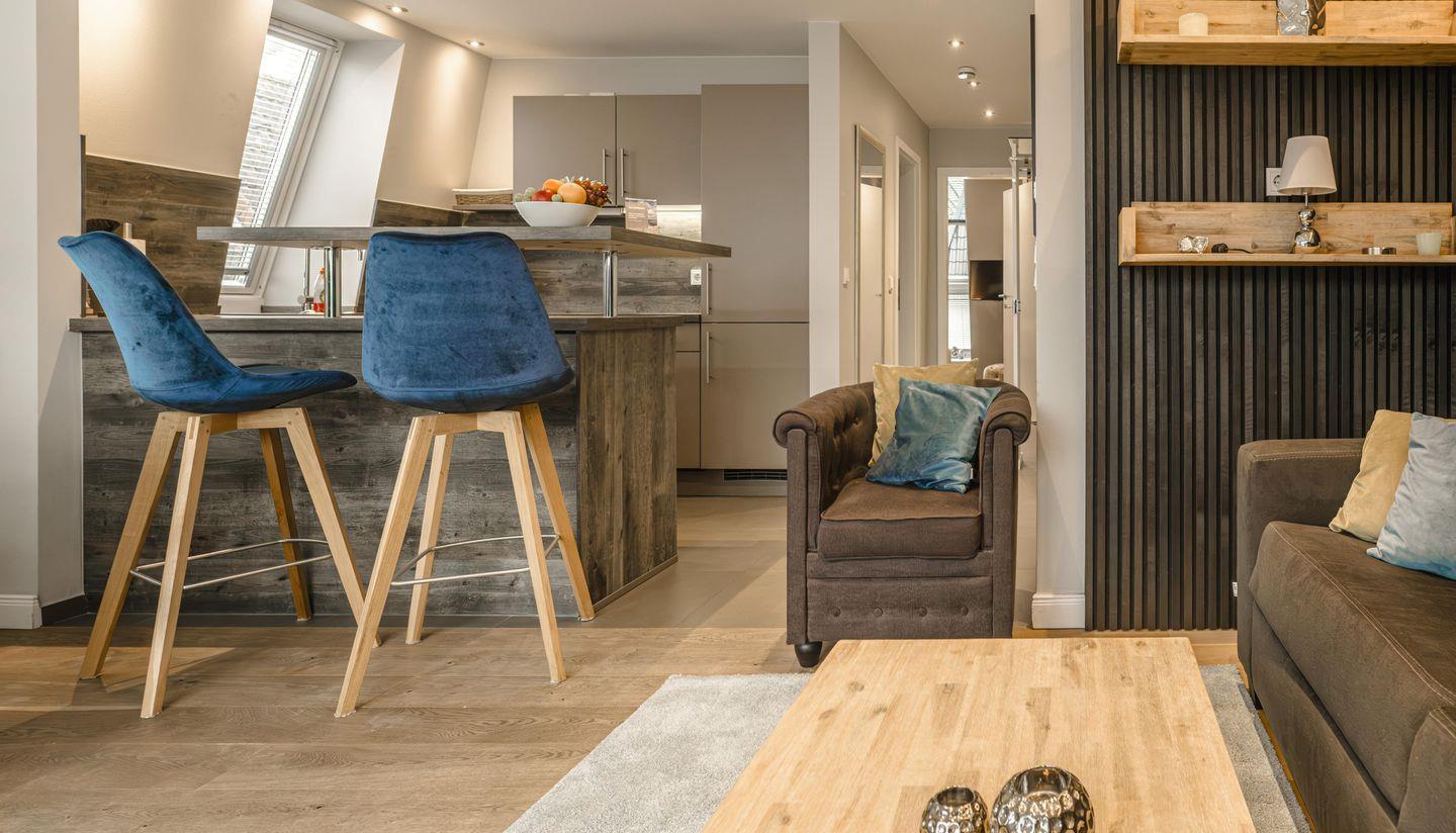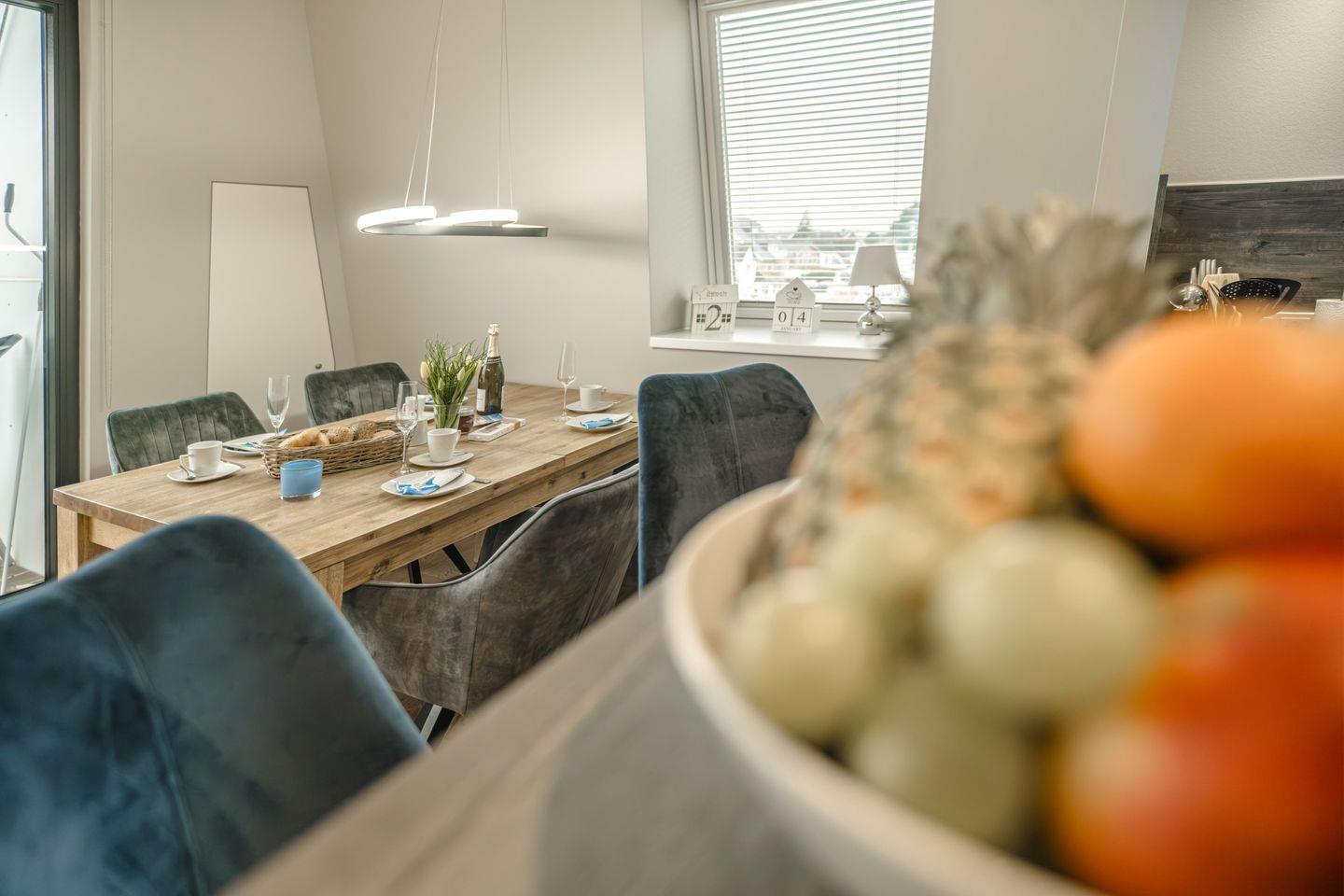 Die Ferienwohnungen Leuchtturm und Düne befinden sich im 2. Obergeschoss und entsprechen vom Schnitt, der Gestaltung und Ausstattung den Ferienwohnungen Strandblick und Strandkorb. Auch sie sind für bis zu vier Personen konzipiert, mit großen Fenstern und Echtholz-Parkettboden ausgestattet.