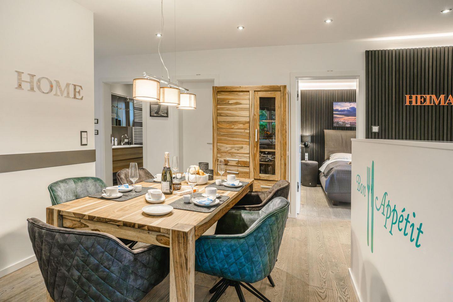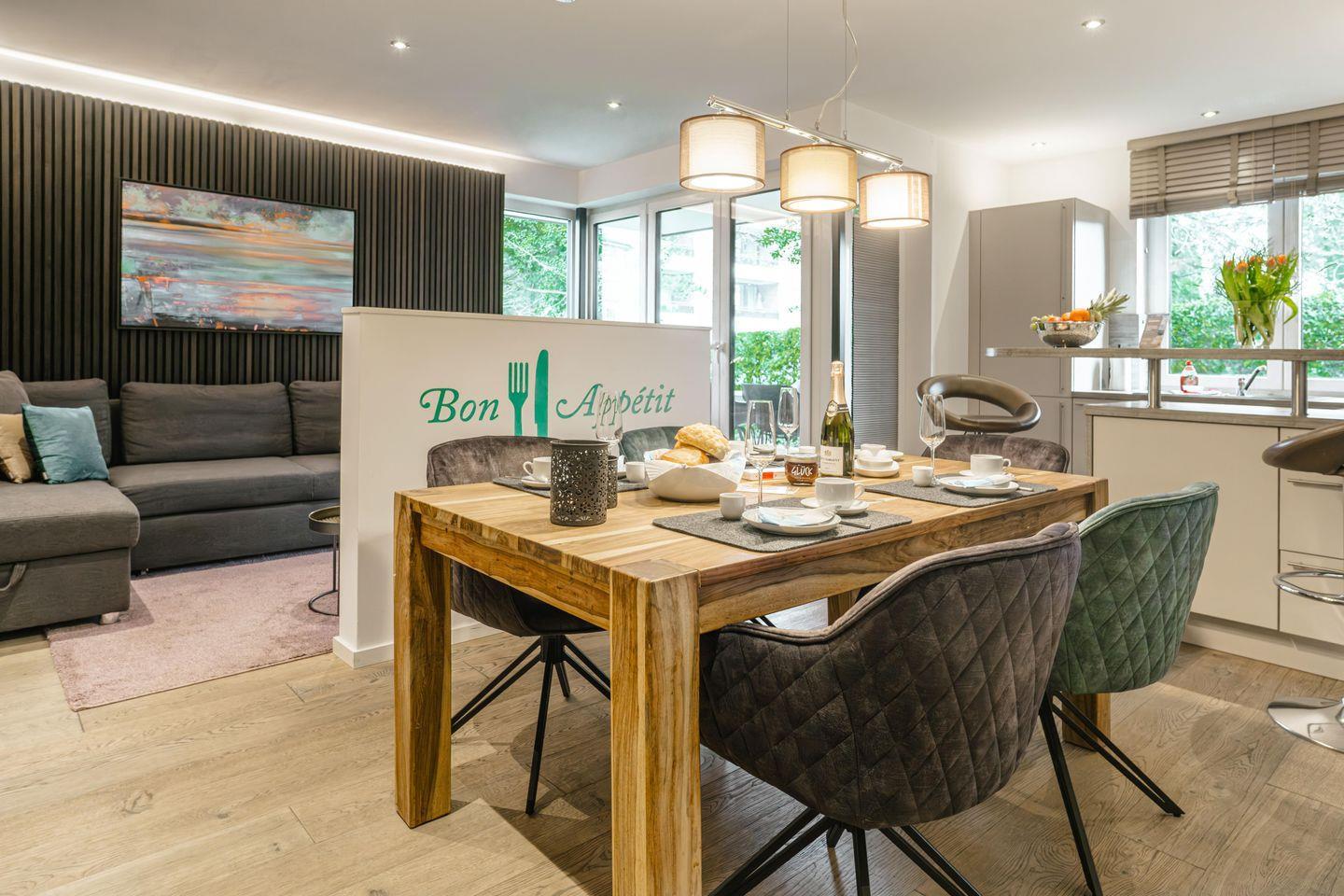Im Erdgeschoss befinden sich die Ferienwohnungen Welle und Muschel. Sie sind jeweils 65 qm groß, für bis zu sechs Personen konzipiert und zeichnen sich durch ihre helle Gestaltung, den Echtholz-Parkettboden mit integrierter Fußbodenheizung und ihre ebenso gemütliche wie stilvolle Einrichtung aus.