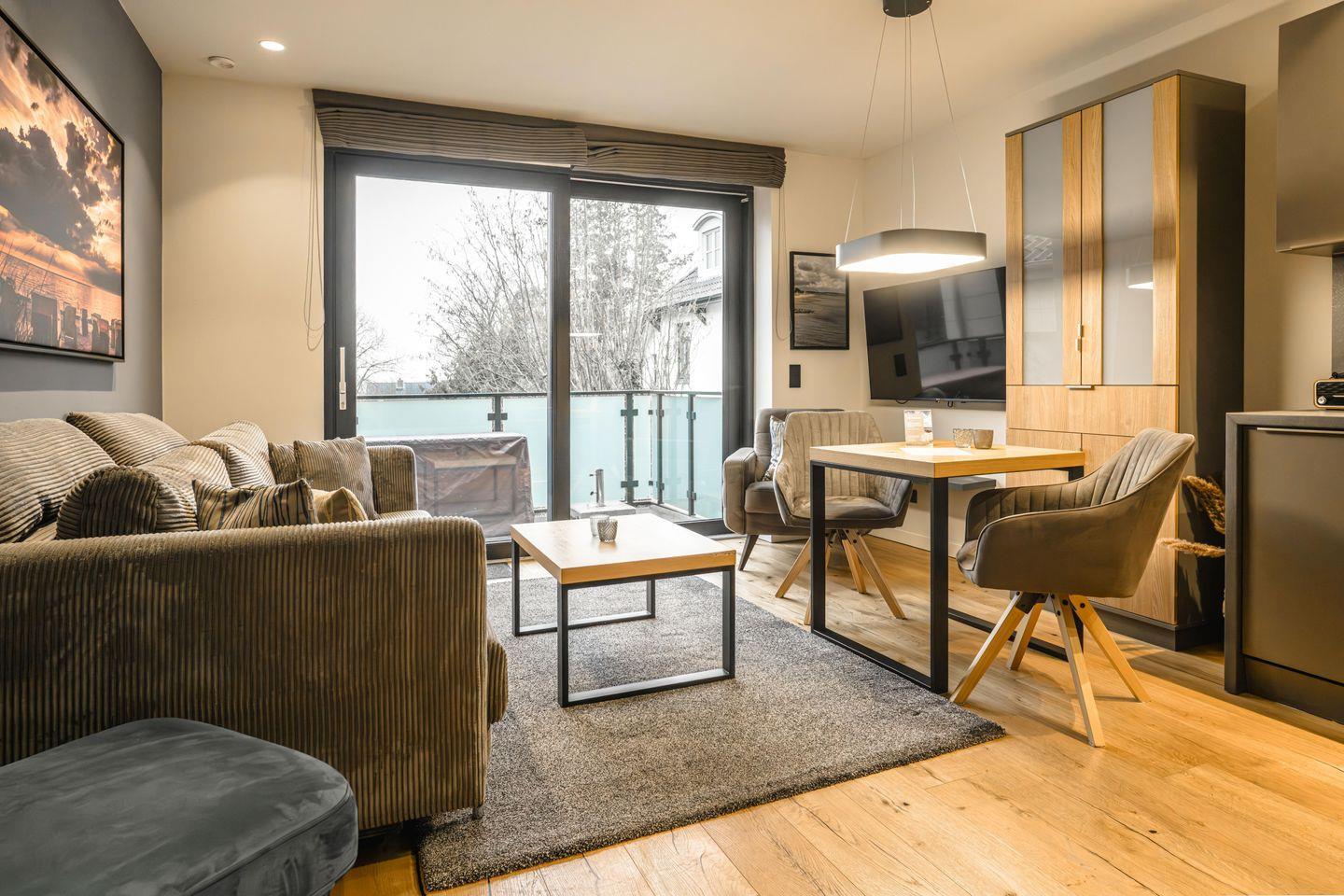 Die Ferienwohnung „Regenbogen“ verteilt sich auf 38 stilvoll und mit viel Charme eingerichteten Quadratmetern. Auch in unserer „kleinsten“ Wohnung fehlt es Ihnen an nichts. Das gemütliche Schlafzimmer ist mit einem großen Boxspringbett ausgestattet. Der Mittelpunkt dieser Wohnung ist der Wohn- und Essbereich. Hier können Sie gemütliche Kochabende zu zweit verbringen und anschließend auf dem 6 qm großen Balkon den Abendn ausklingen lassen. Wie alle Wohnungen, ist auch diese mit Fußbodenheizung und hochwertigen Möbeln ausgestattet.