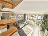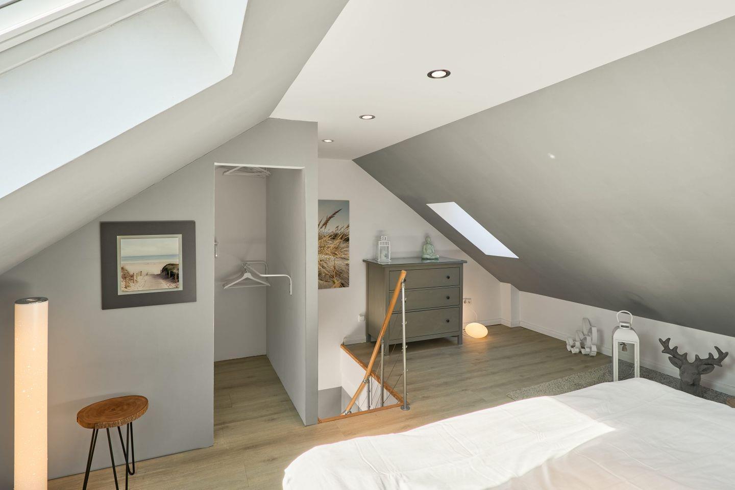 Das gemütliche Schlafzimmer ist über eine Wendeltreppe im Wohnzimmer zu erreichen. Die Fenster lassen sich verdunkeln und Wohlfühlmatratzen sorgen für erholsamen Schlaf. Ausreichend Stauraum bieten Kommoden und ein begehbarer Kleiderschrank.