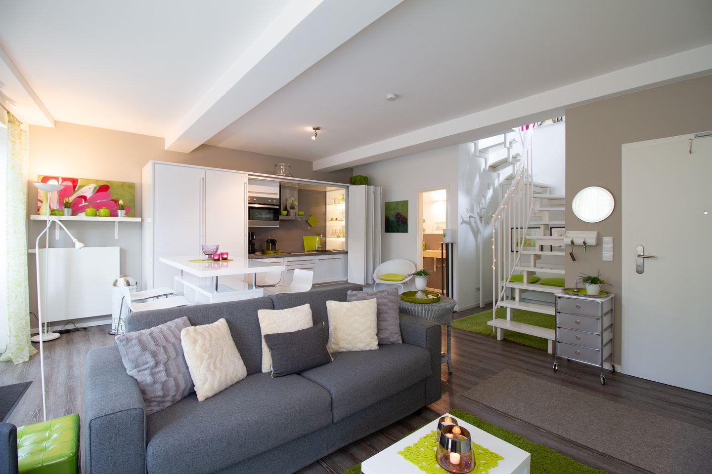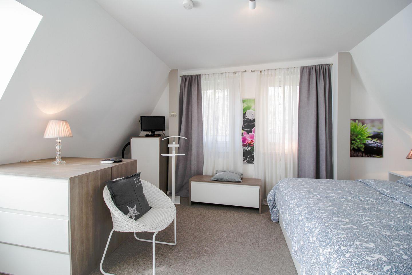 Zusätzlich finden Sie auf dieser Ebene einen Garderobenbereich mit Sitzbank unter der Treppe, ein Gäste-WC und den Zugang zum geräumigen Balkon. Über eine Wendeltreppe erreichen Sie das ausgebaute Dachgeschoss mit einer kleinen Galerie, einem behaglichen Schlafzimmer inklusive viel Stauraum und einem modernen Duschbad.