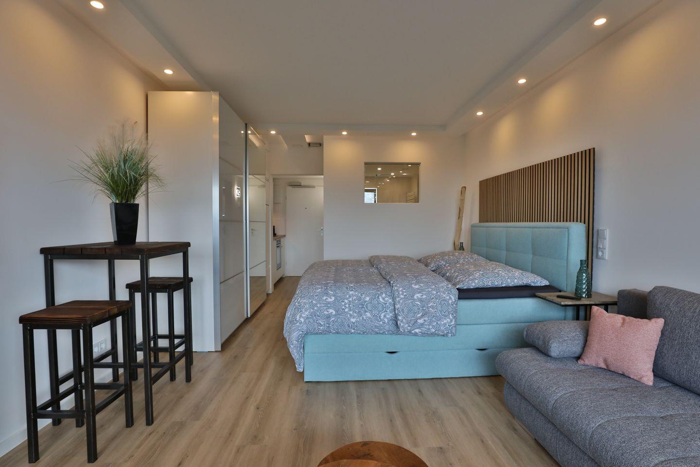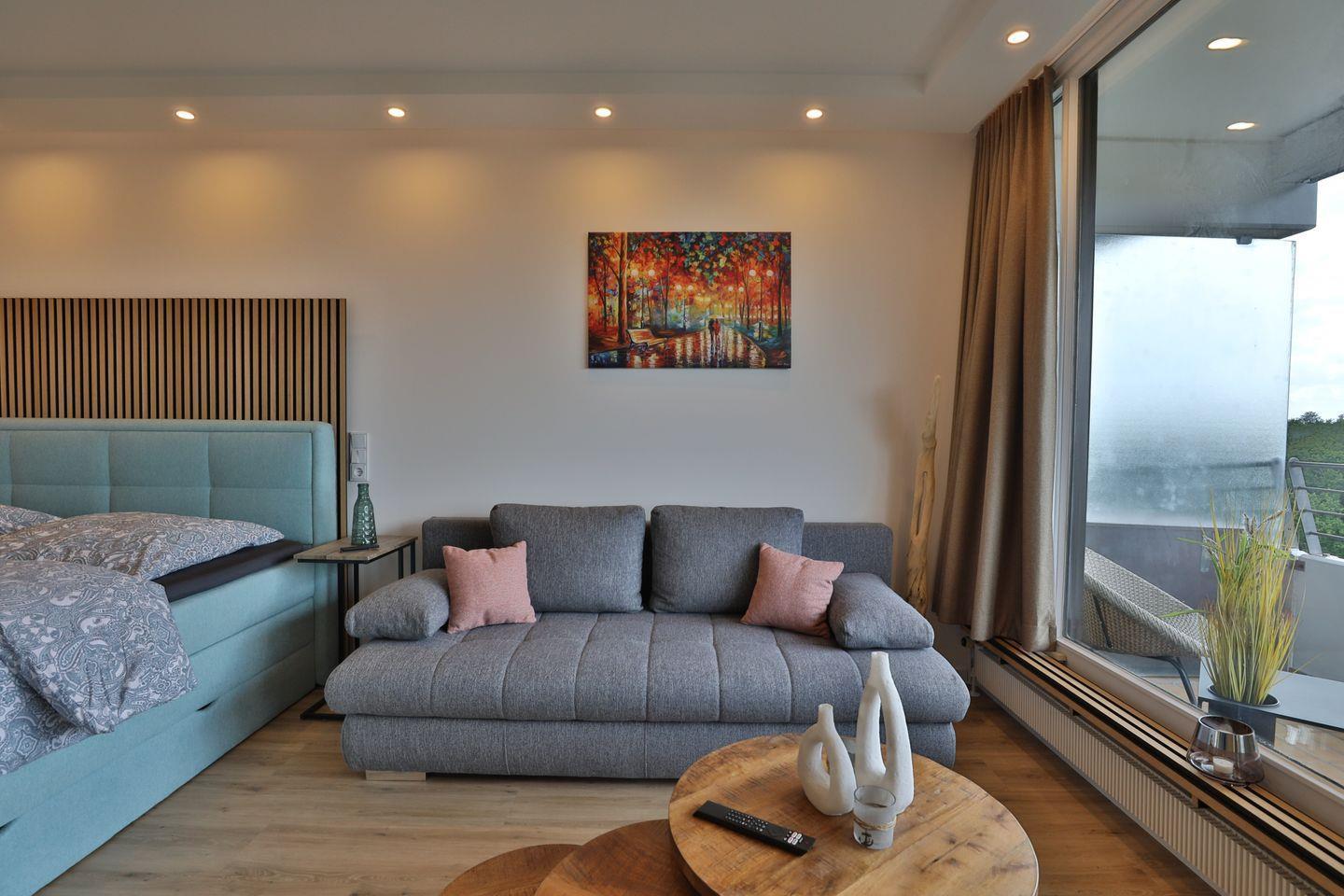 Die barrierearm gestaltete und frisch sanierte Ferienwohnung ist bequem mit dem Fahrstuhl erreichbar. Ein exklusives und geschmackvolles Interieur erwartet Sie, darunter ein großes, gemütliches Boxspringbett, eine bequeme Sitzecke sowie ein kleiner Essbereich mit Bartisch und -stühlen. Im großzügigen Kleiderschrank finden Kleidung und Koffer problemlos Platz. Die voll ausgestattete Küchenzeile ermöglicht das Zubereiten leckerer Mahlzeiten.