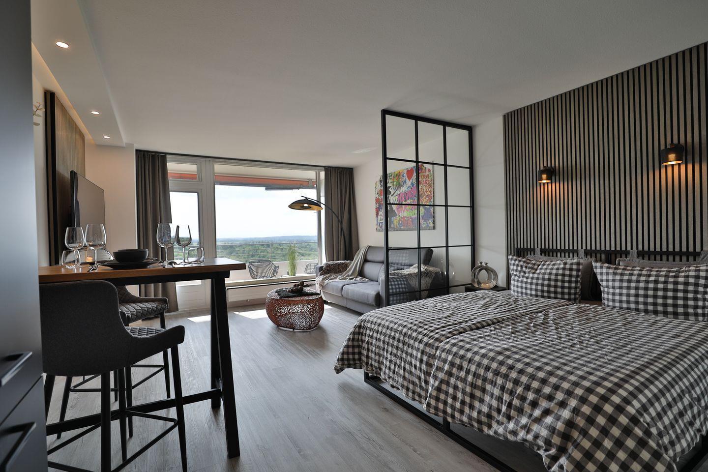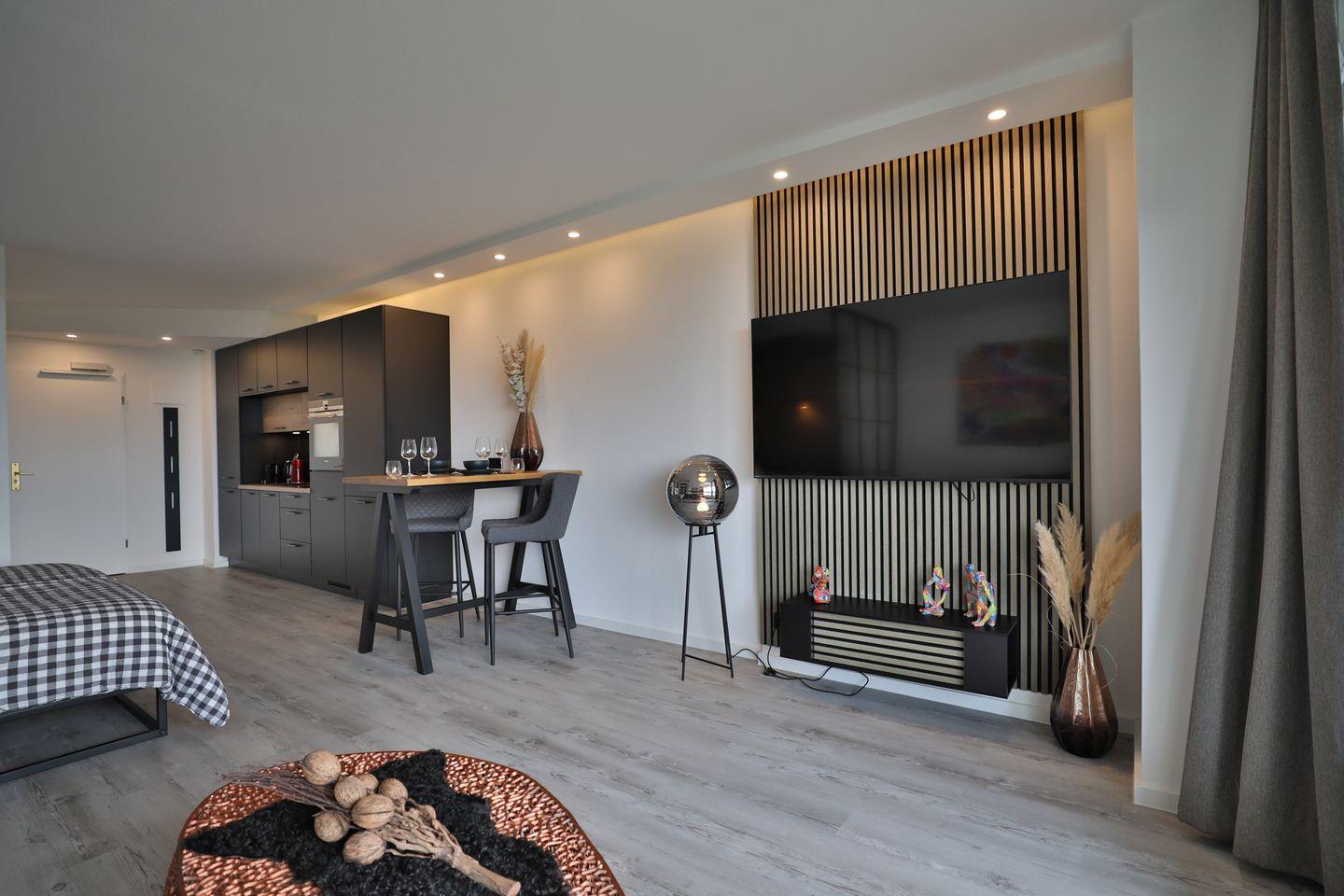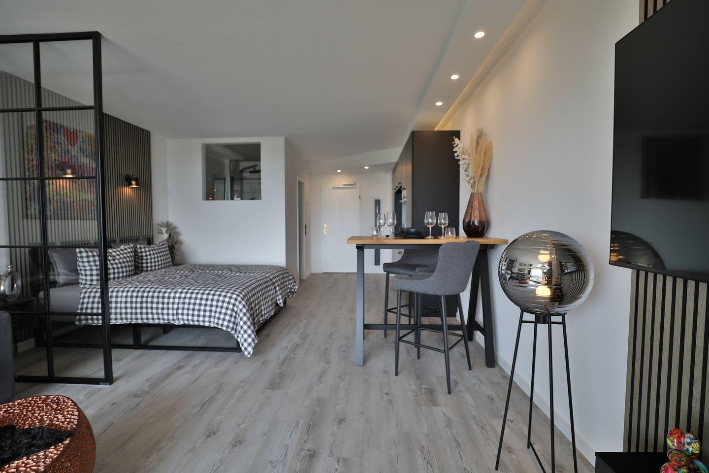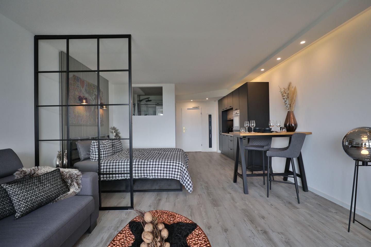Die barrierearme und kürzlich renovierte Wohnung ist bequem per Fahrstuhl zugänglich und im trendigen Industrial Style eingerichtet. Das exklusive, geschmackvolle Interieur umfasst ein großes, gemütliches Boxspringbett, eine einladende Sitzecke und einen kleinen Essbereich mit Bartisch und Stühlen. Ein geräumiger Kleiderschrank bietet viel Platz für Kleidung und Gepäck, während die komplett ausgestattete Küchenzeile das Zubereiten von Mahlzeiten einfach macht.