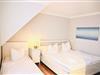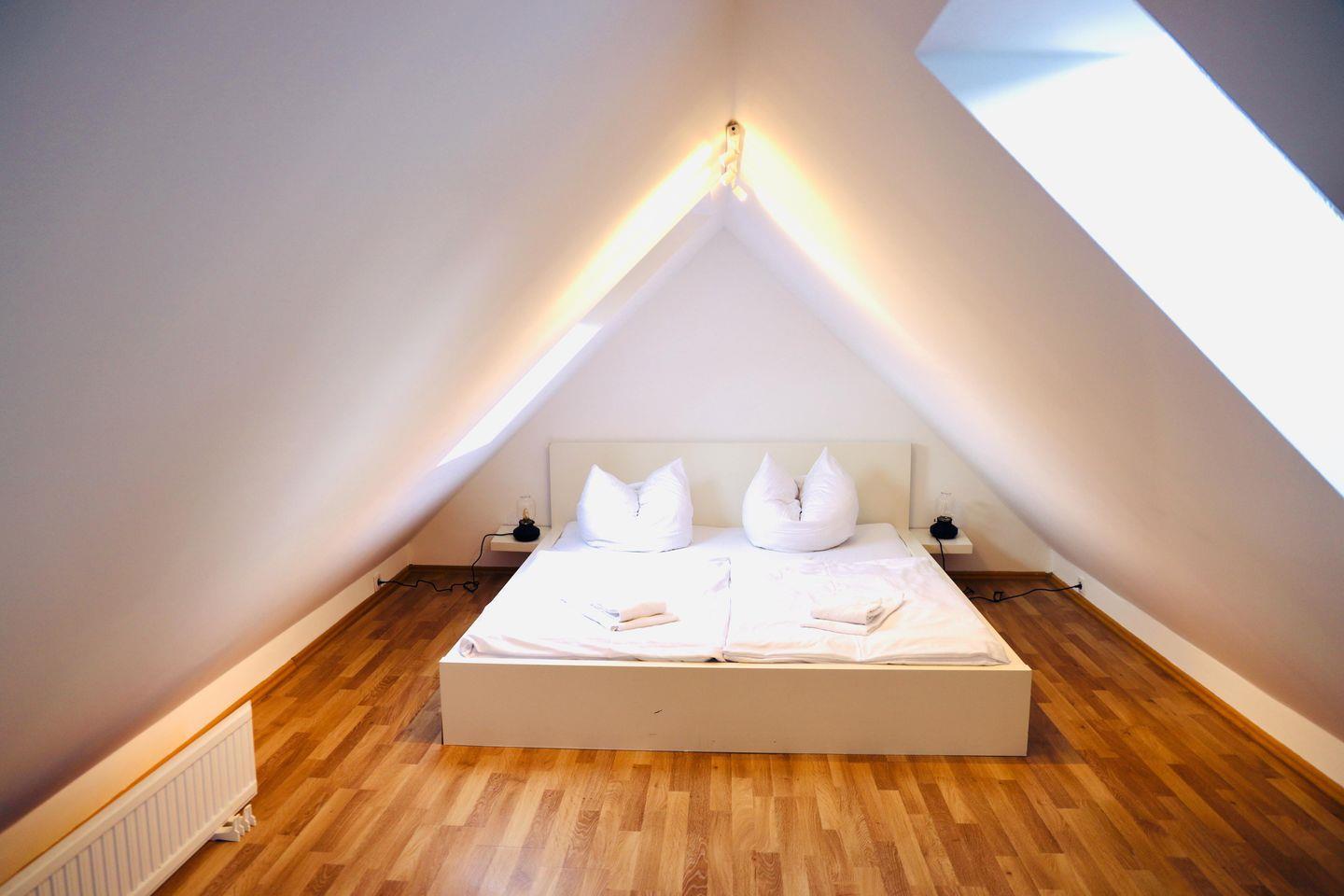 In der Wohnung gibt es 3 Schlafzimmer auf zwei Etagen. Im unteren Bereich ist Schlafzimmer 1 mit einem Doppelbett (180 x 200 cm) und einem Einzelbett (100 x 200 cm). Im ausgebauten Dachboden findest Du Schlafzimmer 2 mit zwei Einzelbetten (90 x 200 cm). Dieses Zimmer führt zu Schlafzimmer 3 mit einem Doppelbett (180 x 200 cm). Die Schlafzimmer eignen sich gut für Familien.