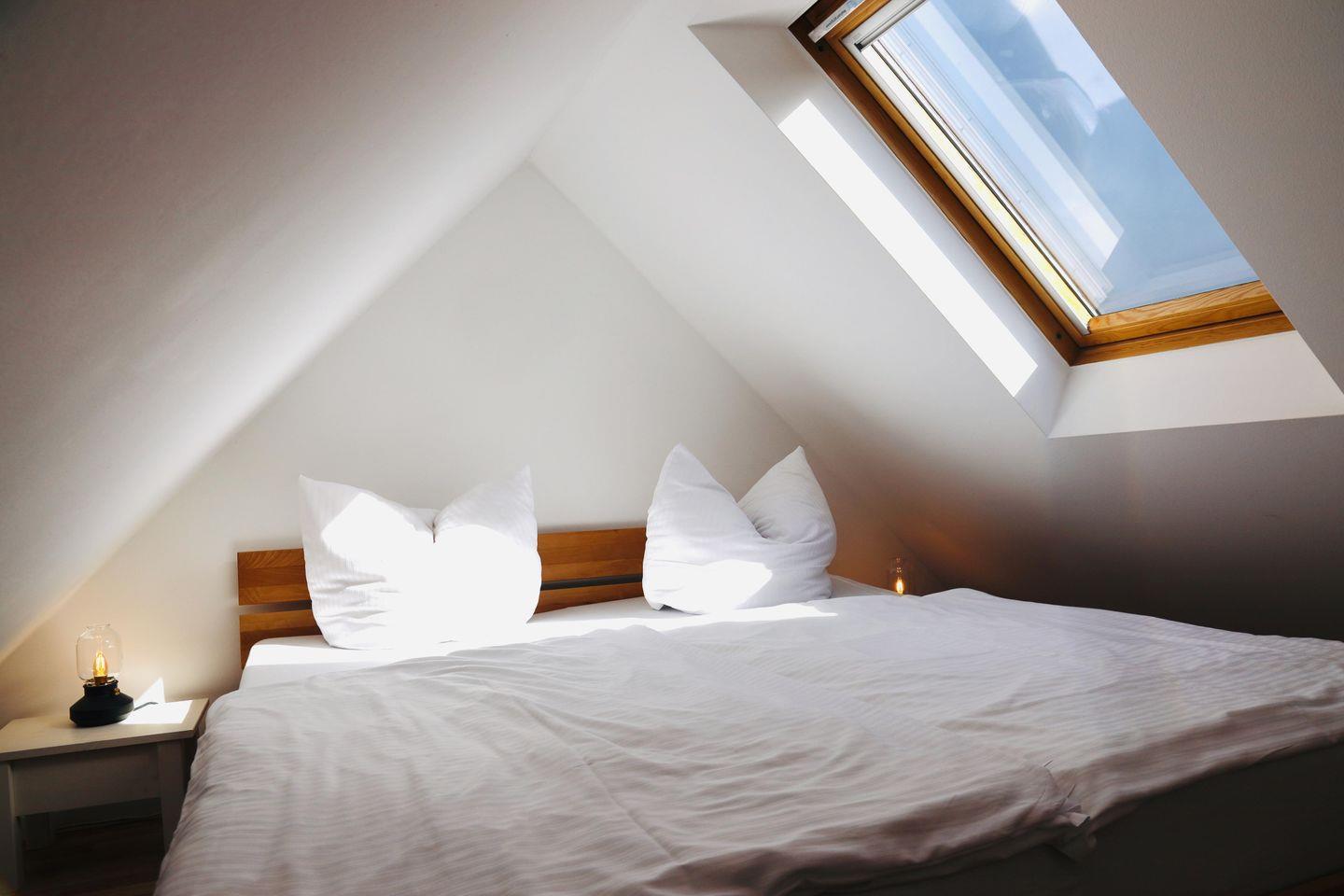 Das Schlafzimmer in Wohnung C befindet sich im ausgebauten Dachgeschoss des gemütlichen Apartments und ist über eine Stiege aus dem Wohnbereich zu erreichen. Vom Bett aus kannst du direkt den Sternenhimmel beobachten. Das Bett ist 160 x 200 cm groß.