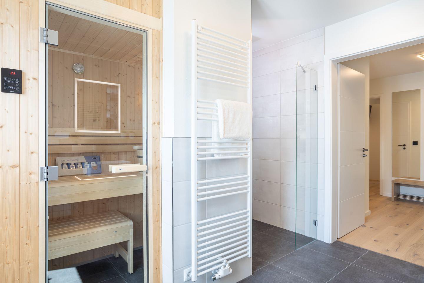 Das moderne Bad mit bodentiefer Rainshower-Dusche und privater Sauna wird zur persönlichen Wellnessoase. Hochwertige Materialien und stilvolle Ausstattung sorgen für besonderen Komfort.