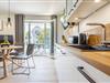 Der helle Wohnbereich mit gemütlicher Sofaecke, großem TV und bodentiefen Fenstern lädt zum Verweilen ein. Die offene Küche ist bestens ausgestattet – ob Frühstück, Mittagessen oder gemeinsames Abendessen, hier wird Kochen zum Vergnügen. Auf dem Südwest-Balkon genießt du die Sonne bis in den Abend.