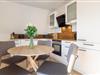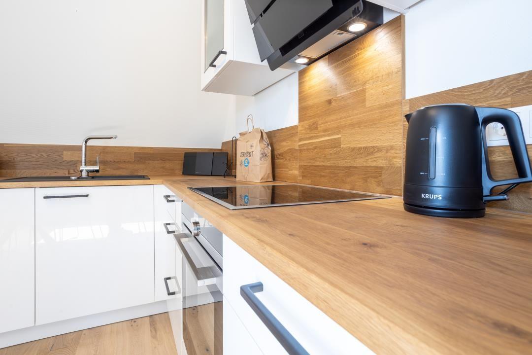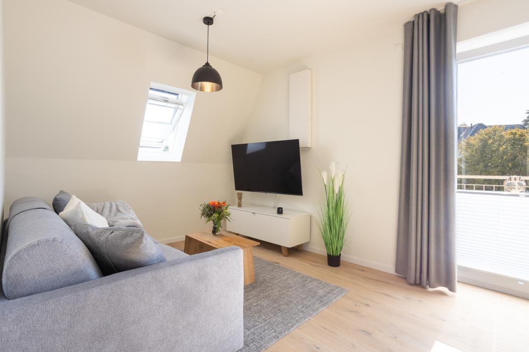 Der offene Wohnbereich ist mit einem gemütlichen Sofa, Smart-TV und Essplatz ausgestattet. Durch die große Fensterfront hast du Zugang zum überdachten Balkon – ideal für ein Frühstück in der Sonne oder ein Glas Wein am Abend.