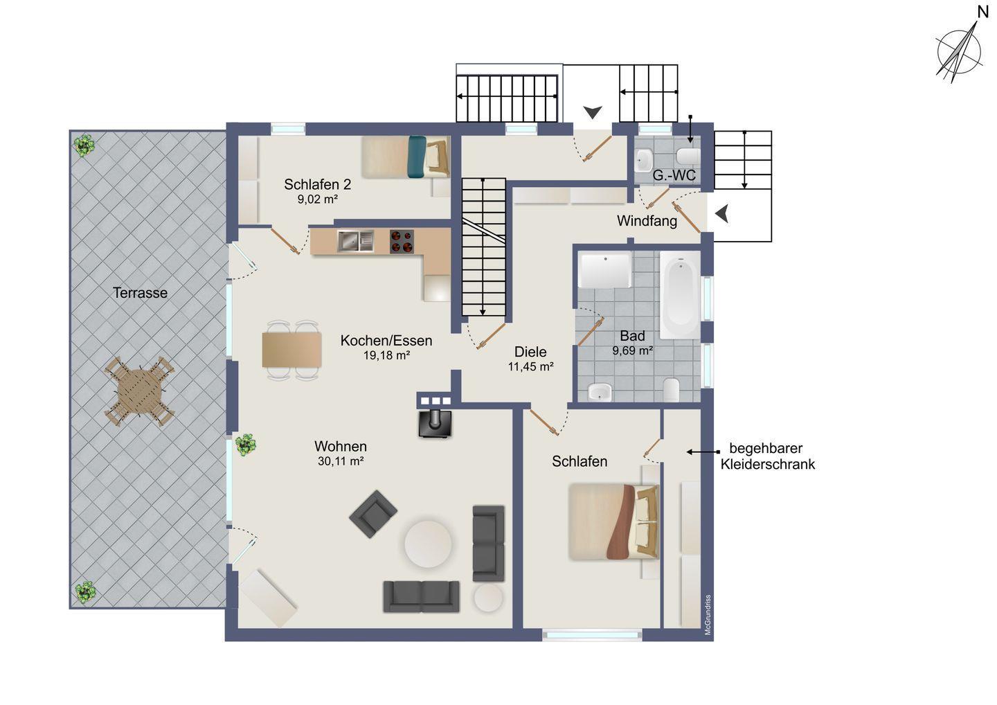 Ein echtes Highlight ist die große Sonnenterrasse mit Essplatz und Liegen – hier genießt man entspannte Stunden im eigenen, geschützten Garten.