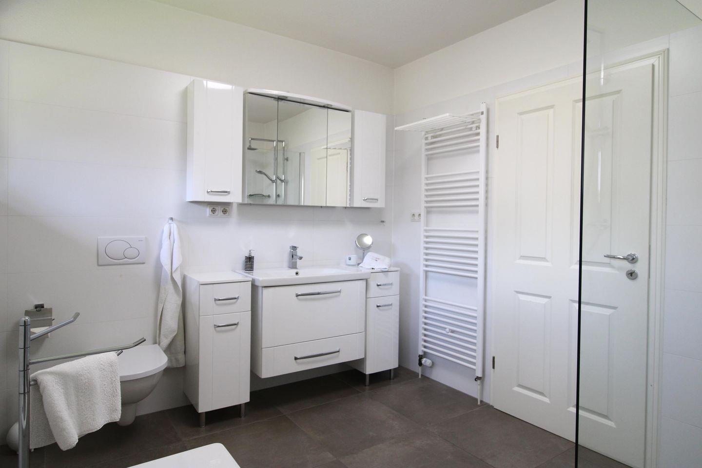 Das Schlafzimmer verfügt über ein komfortables Doppelbett sowie ein begehbares Ankleidezimmer, das zusätzlichen Stauraum und Komfort bietet. Das moderne Badezimmer ist mit einer bodengleichen Regendusche und einer Badewanne ausgestattet. Zusätzlich steht ein Gäste-WC zur Verfügung.