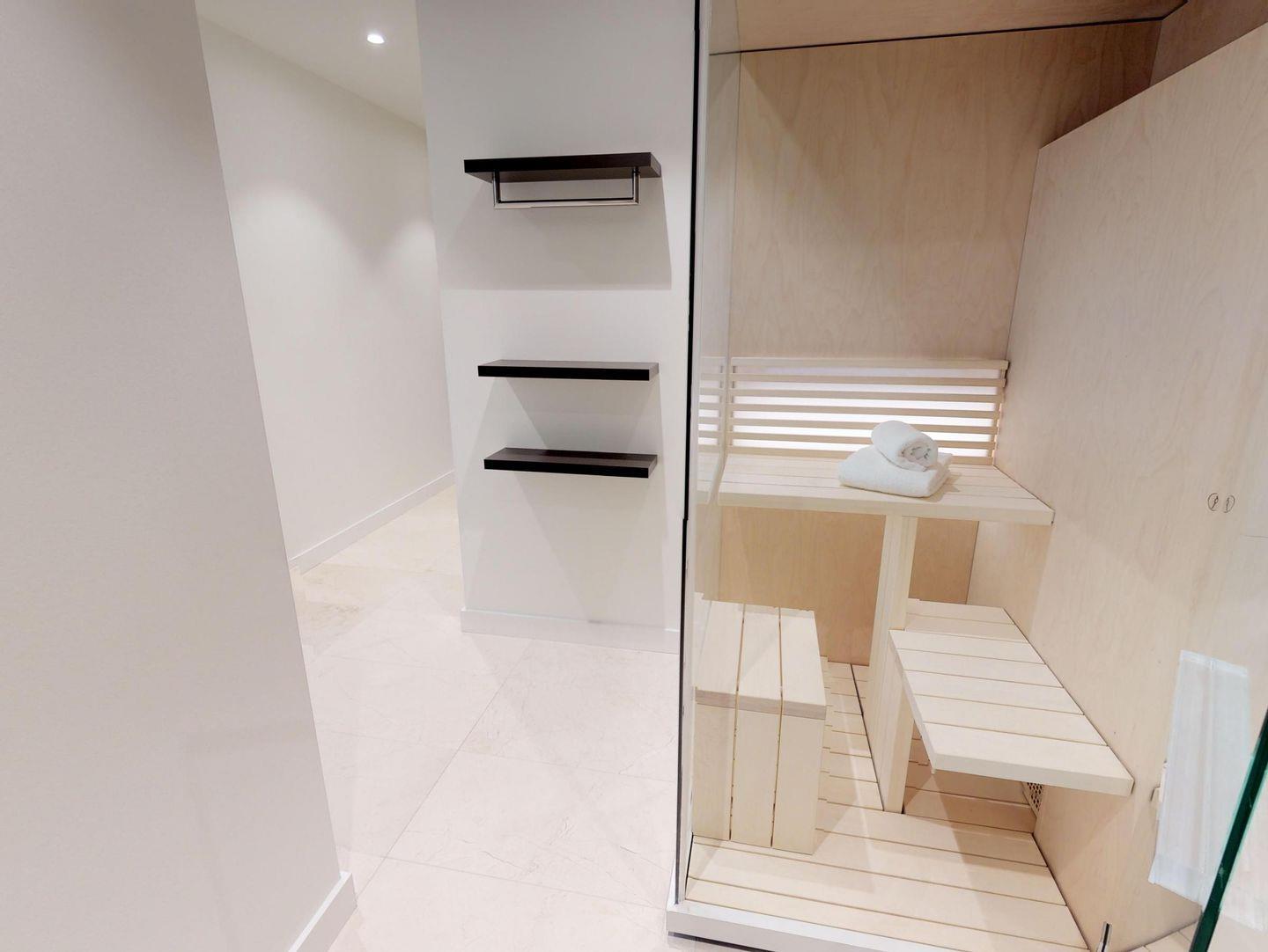 Im Untergeschoss befinden sich zwei Schlafzimmer mit Boxspring-Doppelbetten - ein Schlafzimmer davon mit eigenem Bad. Beide Schlafzimmer haben Zugang zu der großzügigen, möblierten Terrasse mit Strandkorb. Zusätzlich bietet die Schlafcouch im offenen Wohnbereich zwei weitere Schlafplätze. Das Untergeschoss wird durch ein extra Bad und eine kleine Sauna (1,17m x 1,17m) im Flur ergänzt. Von hier aus gelangen Sie auch in die Tiefgarage.