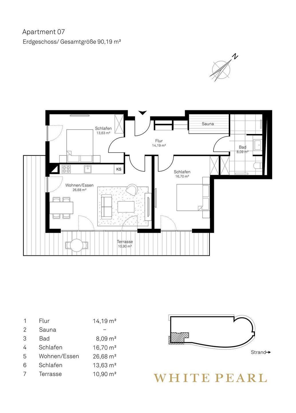 Wenige Minuten vom Strand entfernt befindet sich die Luxussuite 0.07 im Erdgeschoss des "White Pearl" und bietet auf 90 m² Platz für 5 Personen – auch Ihr Hund ist willkommen. Die Suite verfügt über zwei separate Schlafzimmer sowie ein Schlafsofa im Wohnbereich für eine Person.