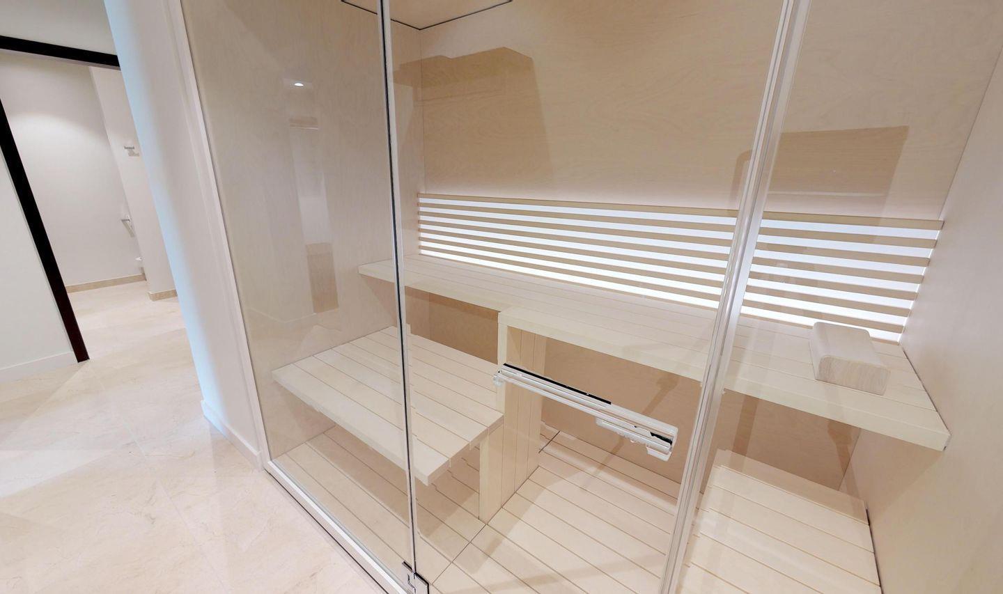 Sie können sich auf einen gemütlichen Wohn-Essbereich freuen. Das Sofa bietet eine Schlafmöglichkeit für zwei Personen. Angrenzend liegt die offene, moderne Küchenzeile mit kompletter Ausstattung. Das separate Schlafzimmer mit einem Boxspring-Doppelbett wird durch Lamellen-Schiebetüren abgetrennt. Das moderne Bad mit Dusche sowie die eigene Sauna (2,37m x 1,19m) runden das Apartment ab.