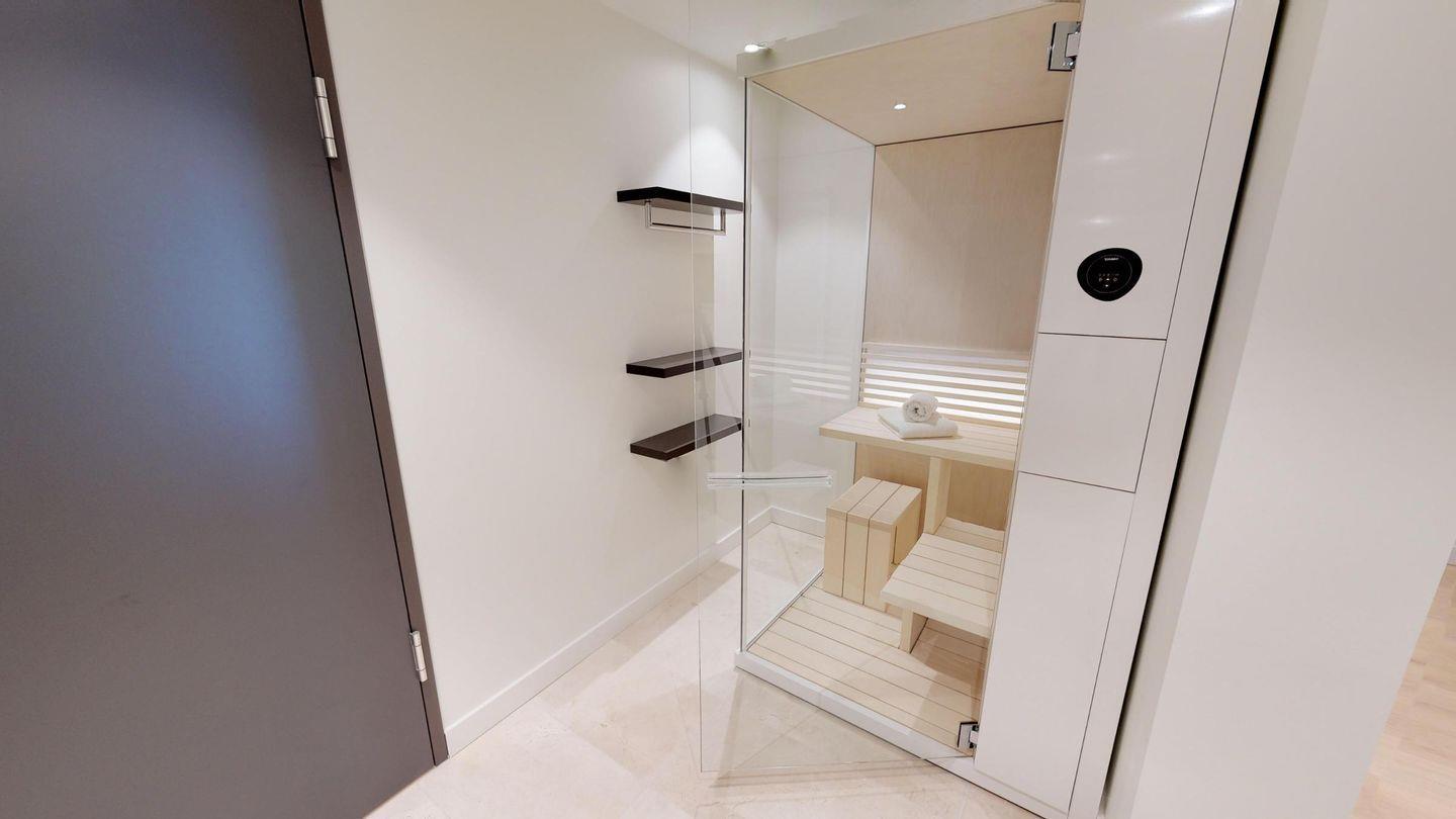 Highlights der Suite sind die eigene kleine Sauna (1,17m x 1,17m) sowie der möblierte Balkon, der entspannte Stunden an der frischen Meeresluft ermöglicht! Zur Wohnung gehört ein Tiefgaragenstellplatz.