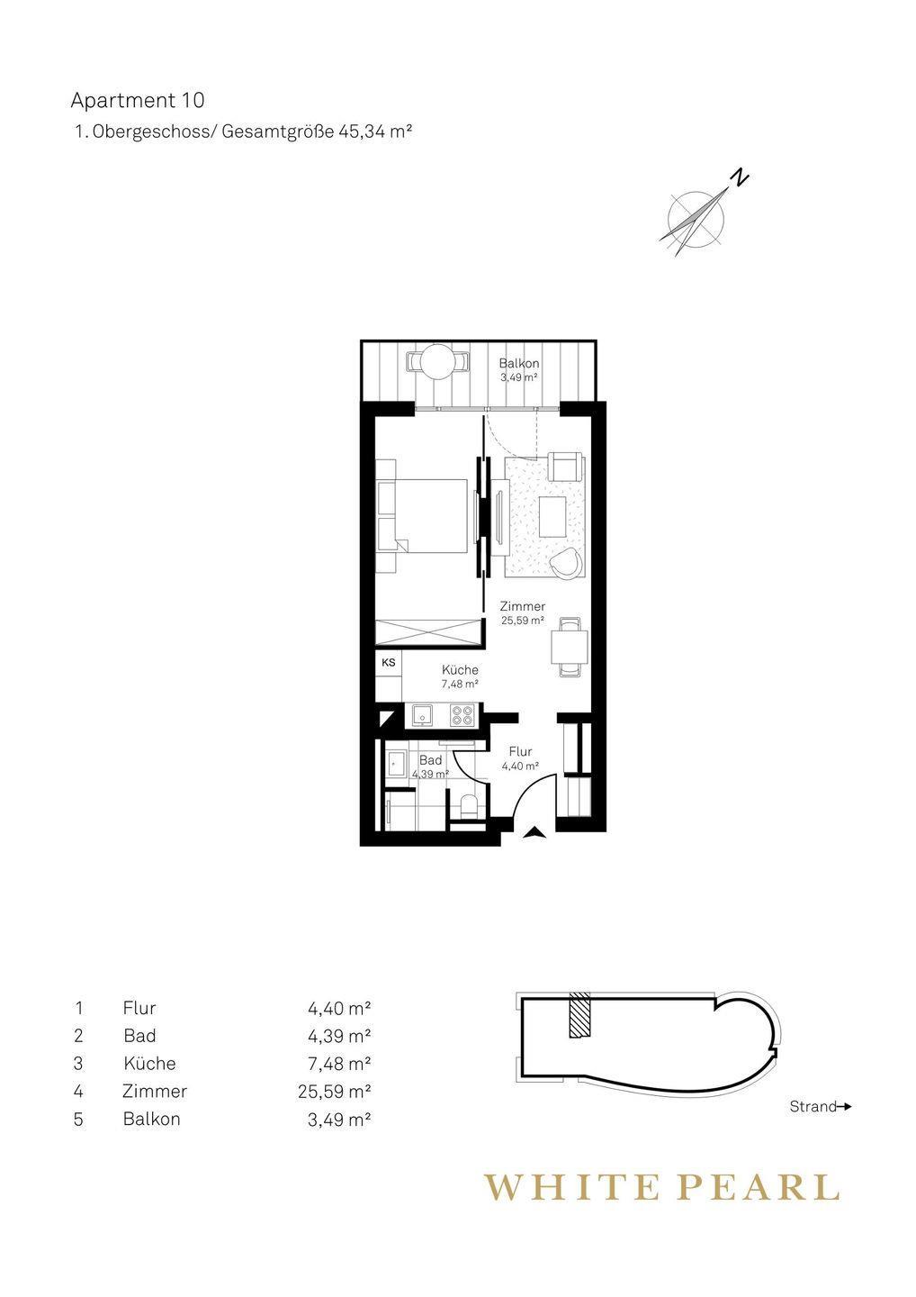 Nur wenige Gehminuten vom Strand entfernt befindet sich das Luxusapartment 1.10 im ersten Obergeschoss des "White Pearl", das auf 45 m² Platz für 2 Personen bietet – auch Ihr Hund ist willkommen!