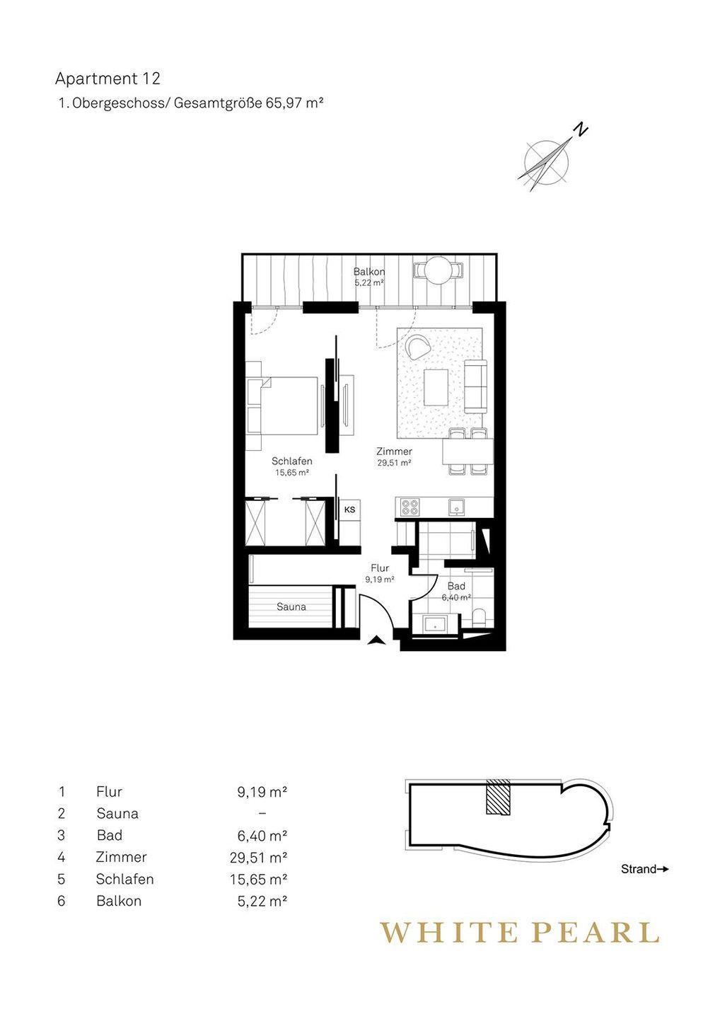 Nur wenige Meter vom Strand entfernt befindet sich das Luxusapartment 1.12 im 1. Obergeschoss des "White Pearl" und bietet auf 66 m² Platz für 2-4 Personen - auch Ihr Hund ist willkommen! Das Apartment verfügt über ein separates, offenes Schlafzimmer sowie ein Schlafsofa im Wohnbereich für zwei Personen.