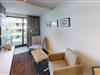 Das Apartment verfügt über eine voll ausgestattete Küchenecke mit einem Essbereich, der an das Wohnzimmer angrenzt. Der offene Wohn- und Essbereich wird durch zwei bequeme Sessel ergänzt. Im separaten Schlafzimmer befindet sich ein Boxspring-Doppelbett, das durch Lamellen-Schiebetüren abgetrennt werden kann. Zusätzlich gibt es ein luxuriöses Badezimmer mit Dusche.