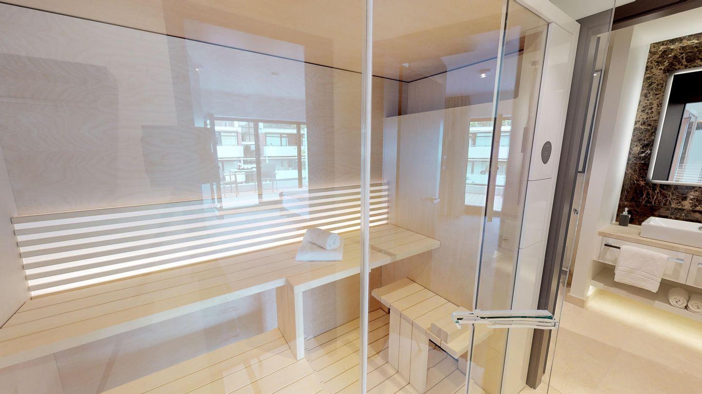 Zu den Highlights des Apartments gehören die eigene Sauna (2,37m x 1,19m) sowie der möblierte Balkon mit Sonnenliegen, der zu entspannten Stunden an der frischen Meeresluft einlädt! Zur Wohnung gehört ein Tiefgaragenstellplatz.