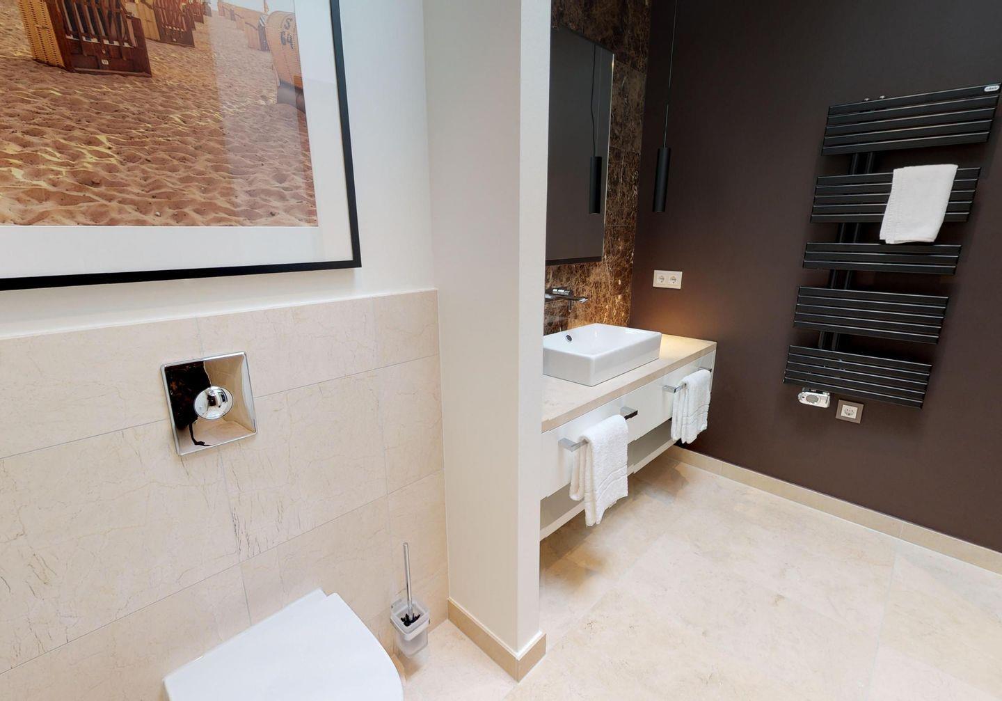 Zu den Highlights des Penthouses gehören eine eigene, gläserne Sauna (2,37m x 1,19m) sowie der herrliche, möblierte Balkon mit Strandkorb, der zu entspannten Stunden an der frischen Meeresluft einlädt. Zur Wohnung gehört ein Tiefgaragenstellplatz. Diese Wohnung ist barrierefrei gemäß der LBO. Unsere Appartements in der obersten Etage sind über die gemeinschaftliche Dachterrasse zu erreichen.