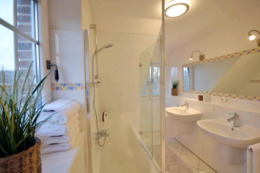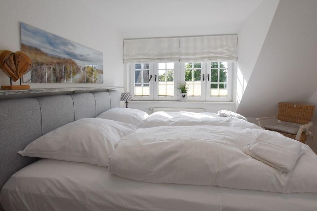 Die 4-Zimmer-Ferienwohnung mit West-Balkon befindet sich im Obergeschoss und Spitzboden des Hauses. Neben dem Elternschlafzimmer befinden sich 2 weitere kleine Schlafzimmer im SB für insgesamt 4 ( eventuell 5 ) Personen. Es gibt ein Wannenbad ( mit Duschmöglichkeit ) und ein Gäste-WC.