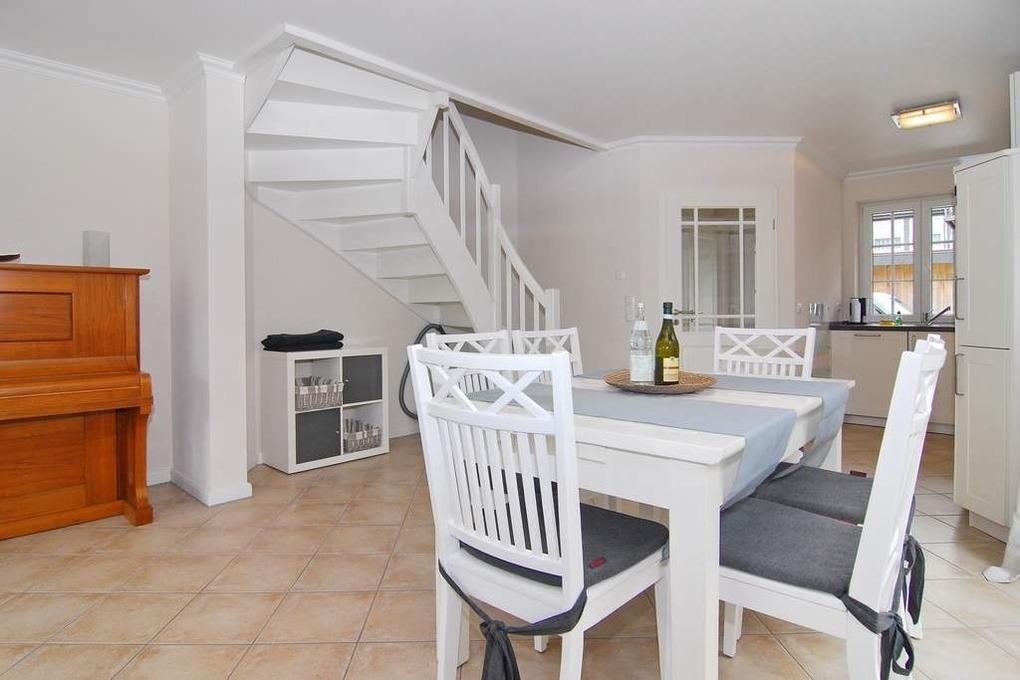 Modernes Endhausteil in Dorflage mit Südterrasse und schönem Garten, "Nichtraucher". Ca. 95 m². EG: Wohn- und Esszimmer mit offener Küche im Landhausstil, Geschirrspüler, Mikrowelle und Backofen sind vorhanden, Couchecke und Essplatz, Flat-TV, Internet, Duschbad/WC. OG: 1 Schlafzimmer mit Doppelbett und TV, 1 Schlafzimmer mit 2 Einzelbetten, Vollbad/WC. PKW-Stellplatz am Haus. Tierhaltung ist nicht gestattet. Bettwäsche und Handtücher sind zur Anreise aufgezogen. 1 Babybett und ein Bettgitter sind vorhanden.