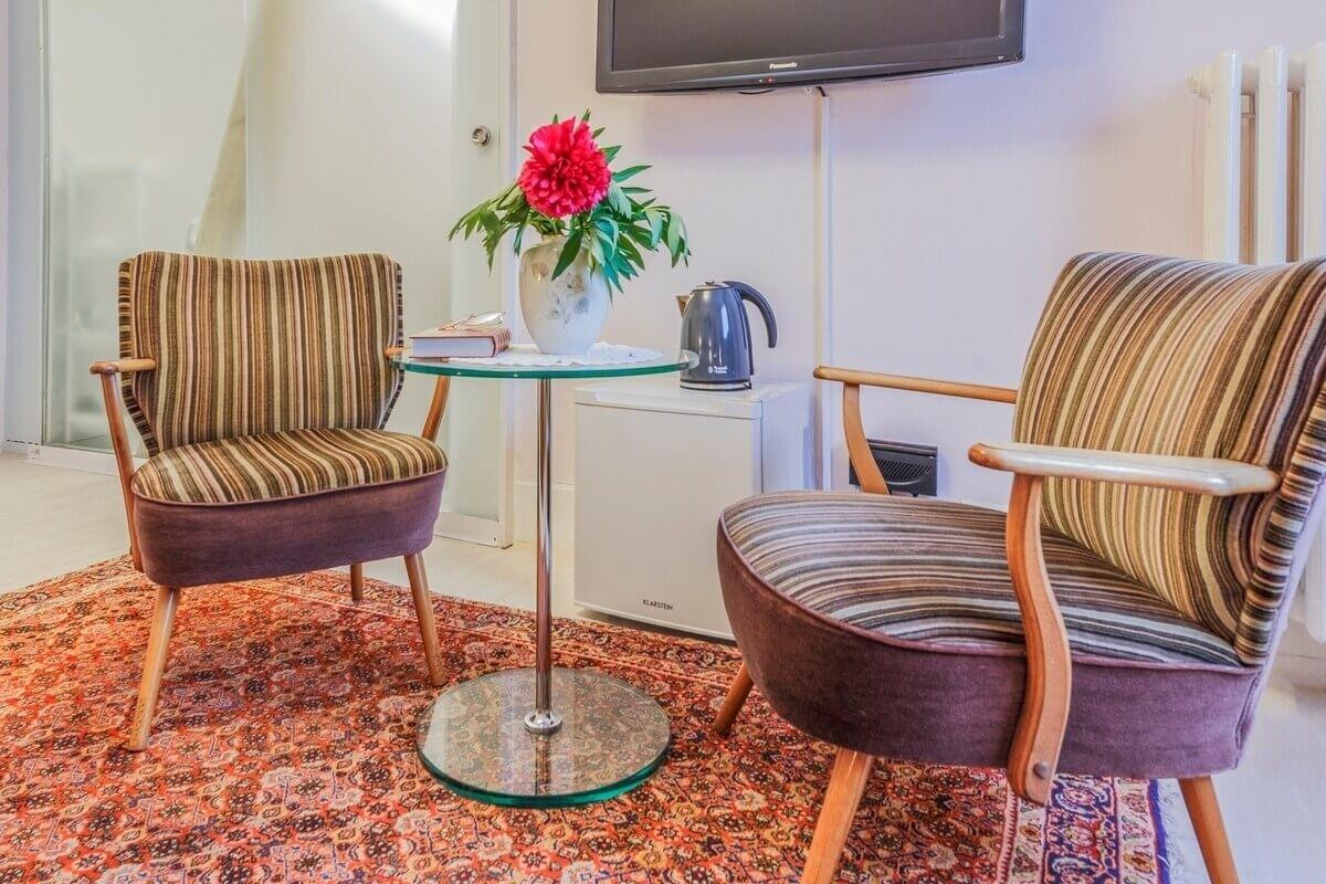 Das 21qm-Studio-Apartment befindet sich im 2.OG im Gästehaus und verfügt über ein gemütliches Schlafzimmer, eine gut ausgestattete Schrankküche mit Esstisch und 2 Stühlen und ein elegantes Bad (Dusche/WC) mit Milchglas-Schiebetür und rustikalen Dachbalken. Eingerichtet ist das Apartment mit hochwertigen, rustikalen Möbeln, zwei bequemen Retro-Sesseln und einem TV, einem rustikalen, großen Bett (1,80 x 2,00).