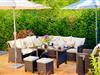 Eine rustikale Außenküche mit Schwenkgrill, Kochplatte und hippe, handgefertigte Upcycling-Möbel, sowie eine große, erhöhte Holzterasse mit hochwertiger Dining-Lounge mit gemütlichen Relax-Liegen, Sitzecke und großem Sonnenschirm.