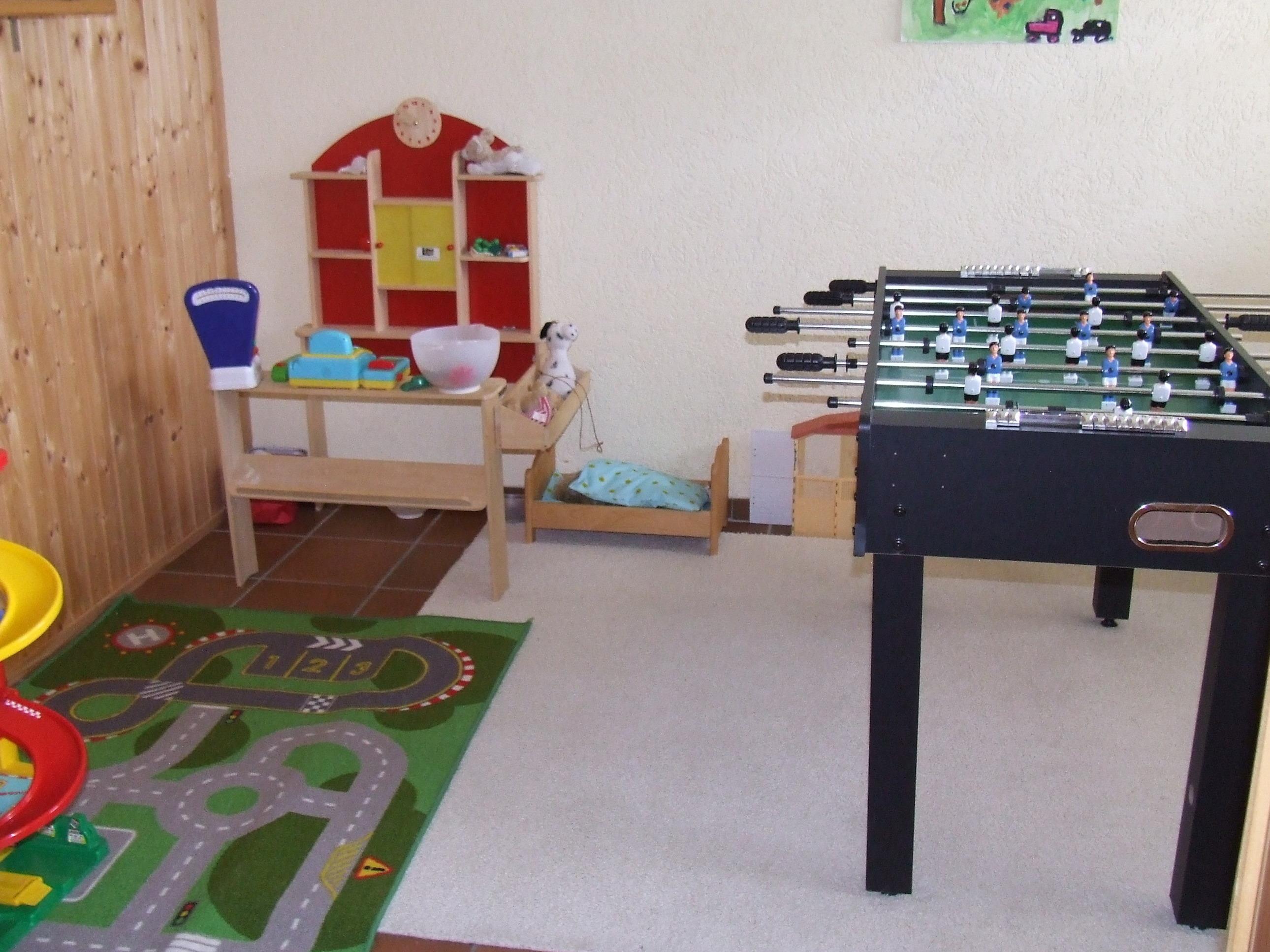 Im Untergeschoss befindet sich unser Spielzimmer mit Tischkicker und vielem mehr. Kinderbücher oder Kinderkassetten stehen zum Lesen oder Hören bereit.