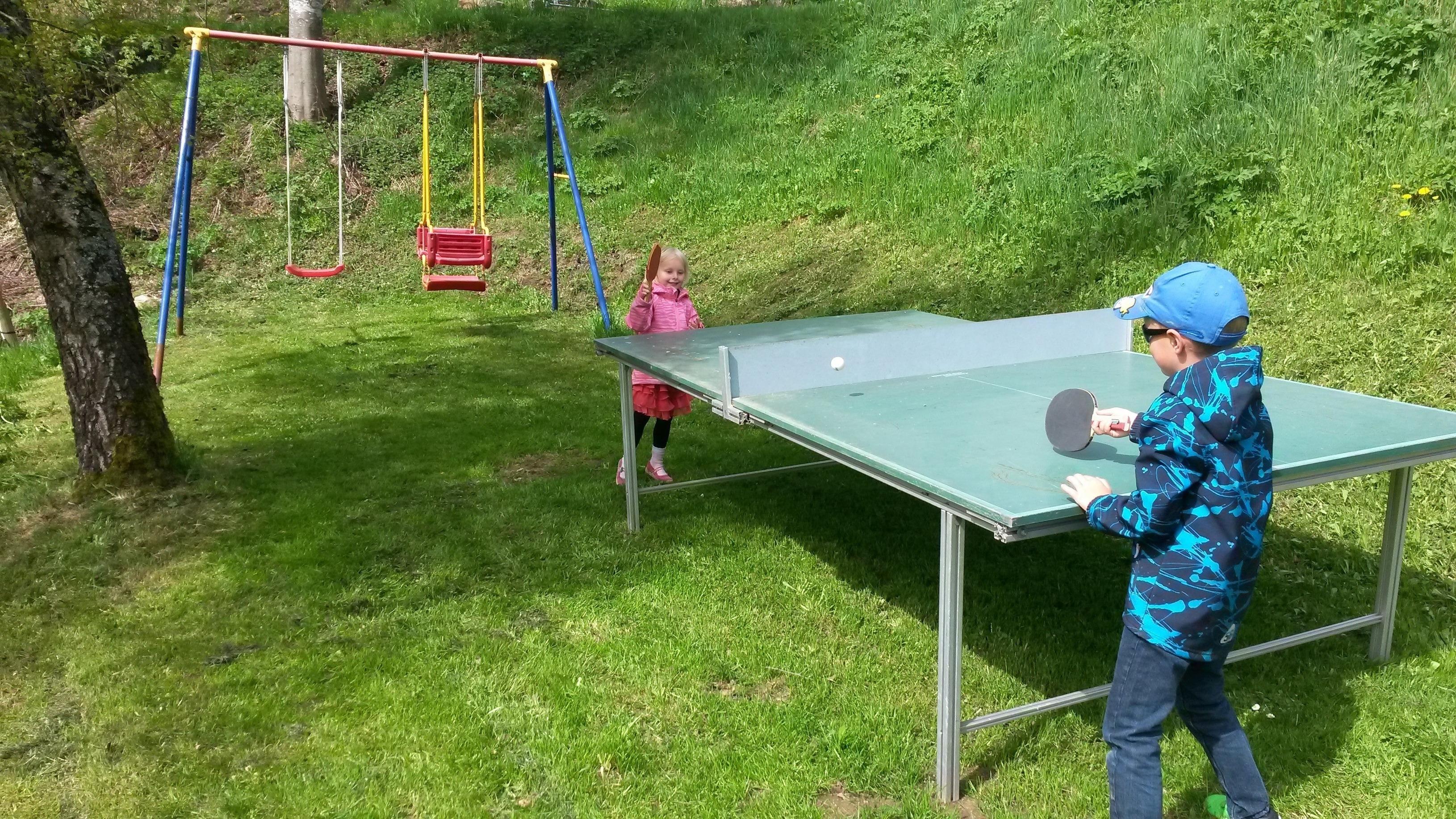 Draußen erwarten Euch Kinder im Sommer 2 Schaukeln, Trampolin, Sandkasten, Tischtennis, ein Baumhaus, sowie das Hasen-und Meerschweinchen-Gehege.